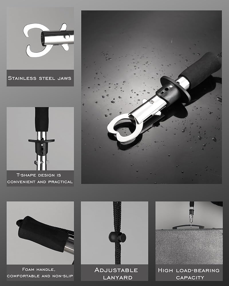 • سهلة الحمل: كماشة الصيد مجهزة بحبل مرن ومثبتة بكم الكماشة عند الخصر، ومشبك شفاه السمكة مجهز بحزام معصم من النايلون قابل للتعديل في النهاية، وهو مريح جدًا للاستخدام والحمل.