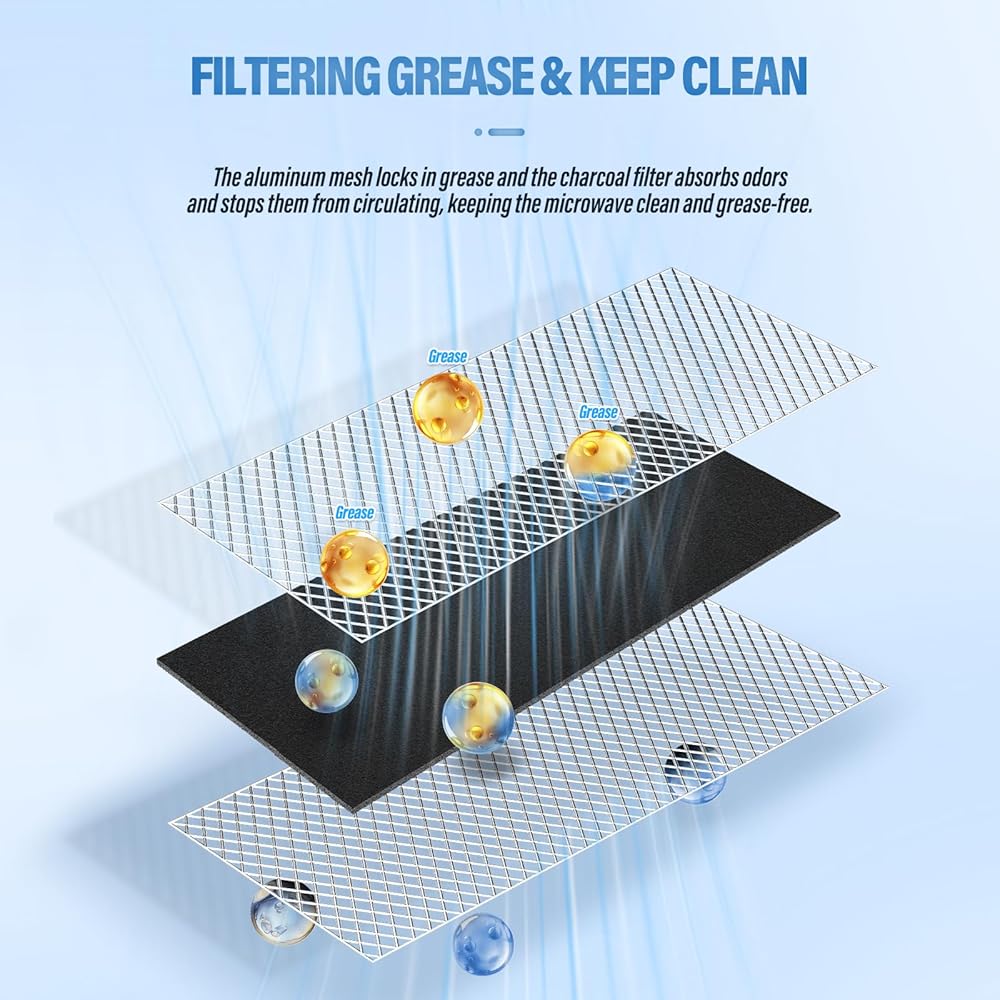 وظيفة الترشيح: نفاذية هواء جيدة وكفاءة ترشيح عالية. تعمل شبكة الألومنيوم على احتجاز الشحوم بشكل فعال، كما تعمل عملية ترشيح الفحم على إزالة الروائح الكريهة من عملية الطهي بشكل فعال. يظل فرن الميكروويف الخاص بك نظيفًا وخاليًا من الزيوت في جميع الأوقات.