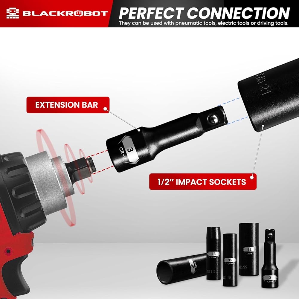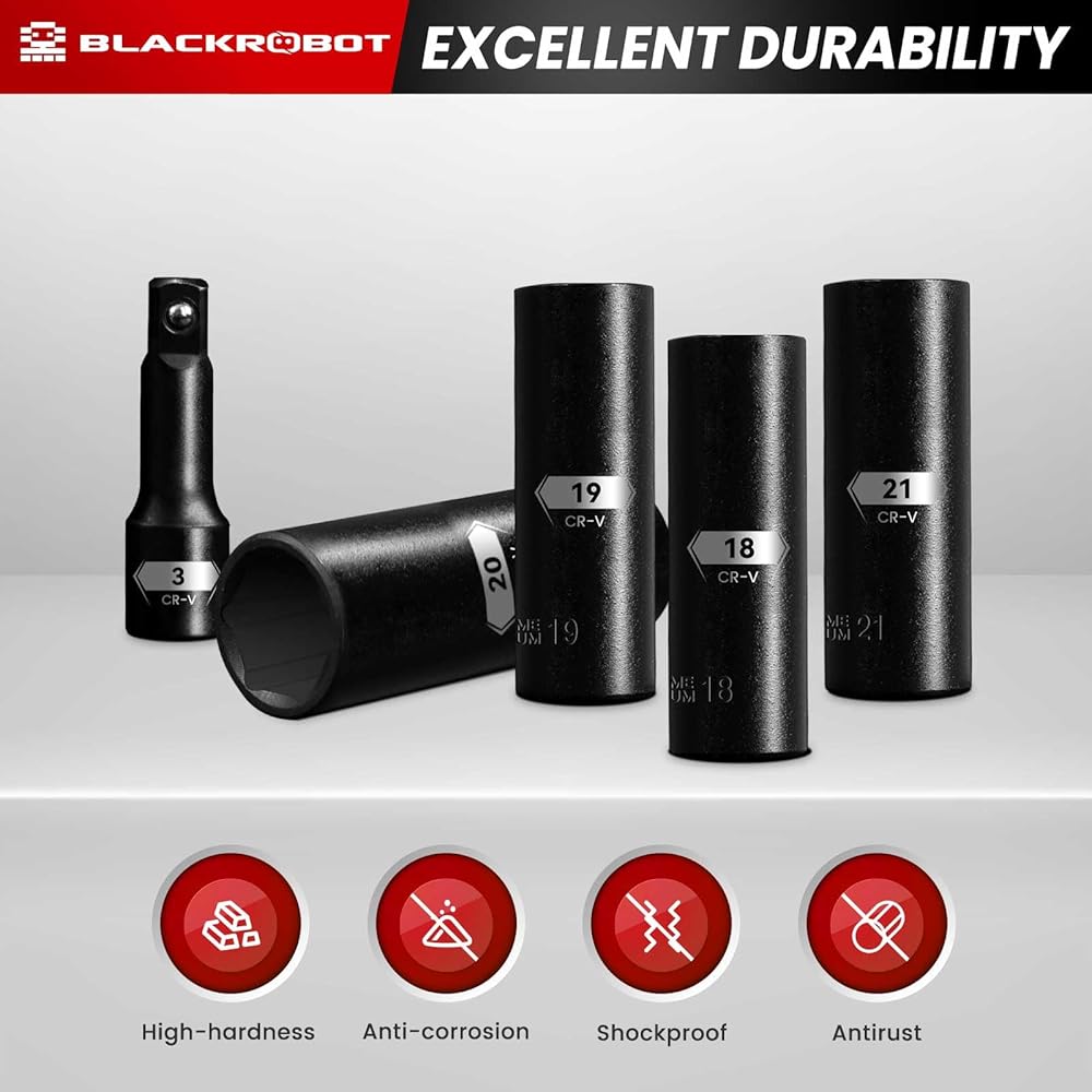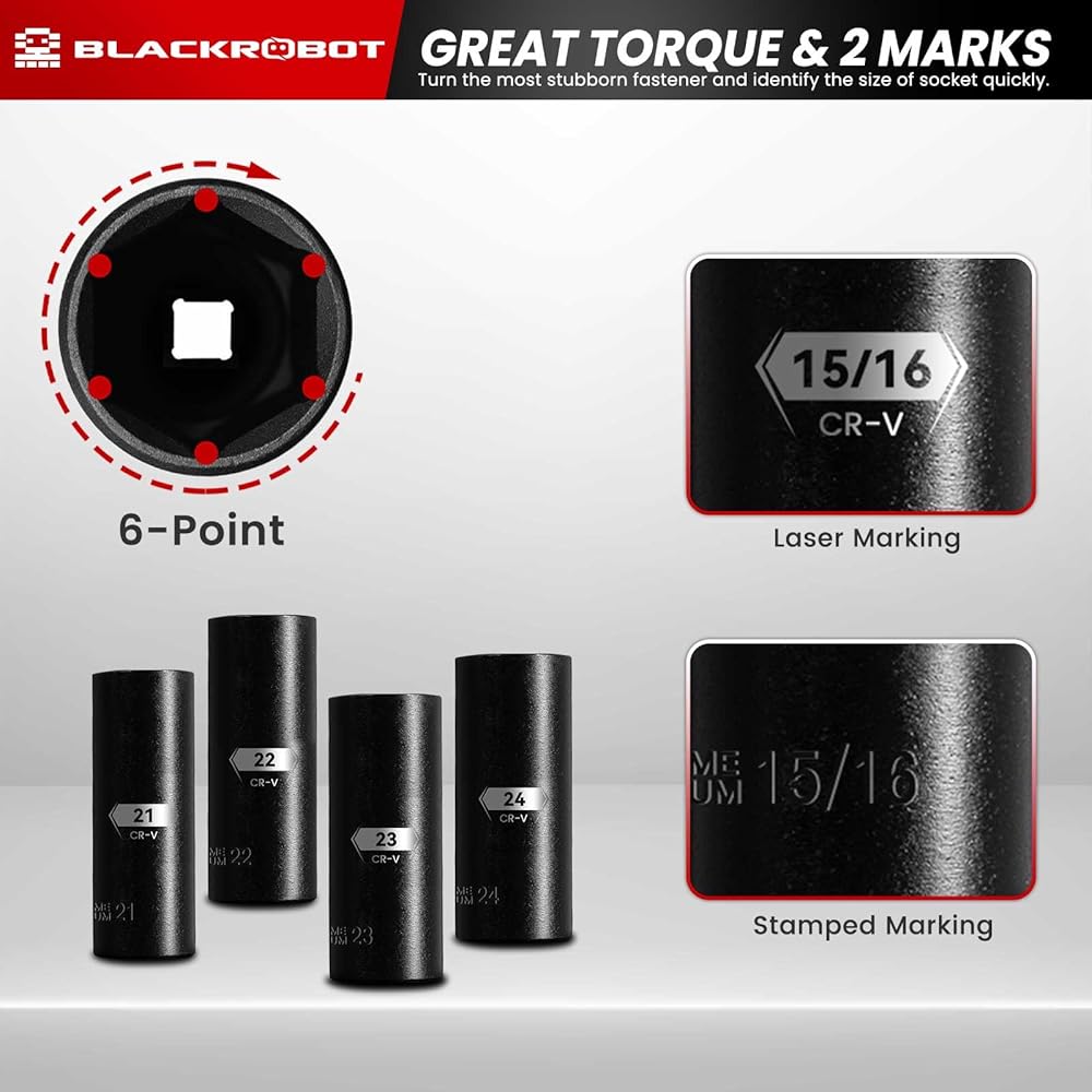 【تصميم من 6 نقاط】تأتي مجموعة مقابس الصدمات بلاكروبوت بتصميم من 6 نقاط. من السهل دمج الصمولة السداسية المجوفة، والتي يمكنها الإمساك بالمثبتات العنيدة دون السقوط، مما قد يمنع الدوران على الصواميل والمسامير تحت جهد عزم دوران عالي. والضغط الناتج عن استخدام مفتاح ربط أو مفتاح ربط كهربائي ذو خرج قوي.
