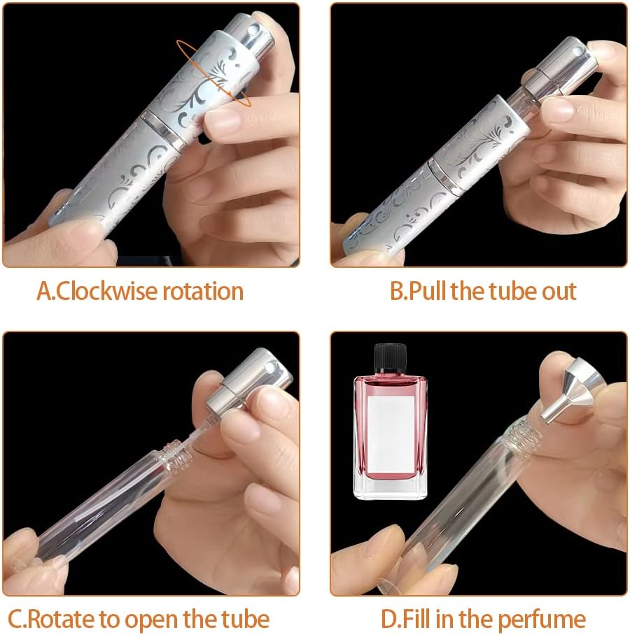 【Easy to refill】- Four steps: 1. Rotate the perfume bottle clockwise; 2. Pull out the glass tube; 3. Rotate to open the cap of the glass tube; 4. Add perfume.