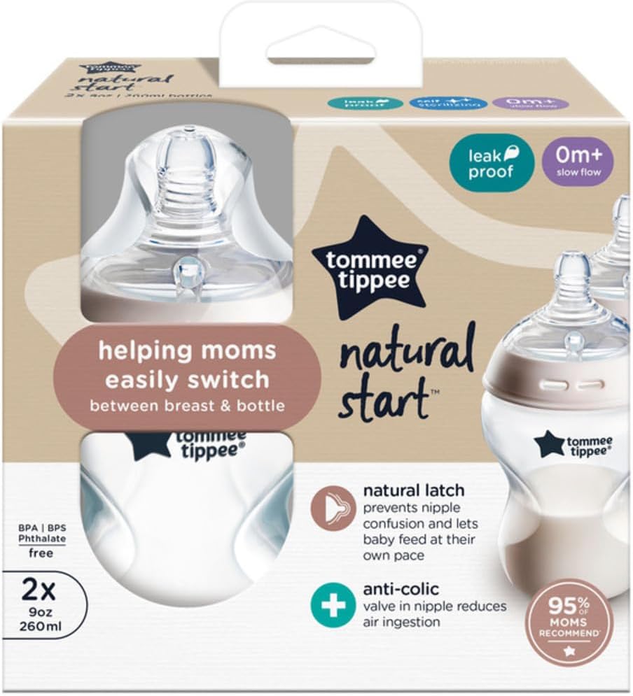 زجاجات الأطفال Tommee Tippee Natural Start المضادة للمغص والخالية من مادة BPA، سعة 9 أونصة، لحديثي الولادة بعمر 0 أشهر فما فوق، حلمة تشبه الثدي ذات التدفق البطيء، مصممة للانتقال السلس بين الزجاجة والثدي، عبوة من قطعتين