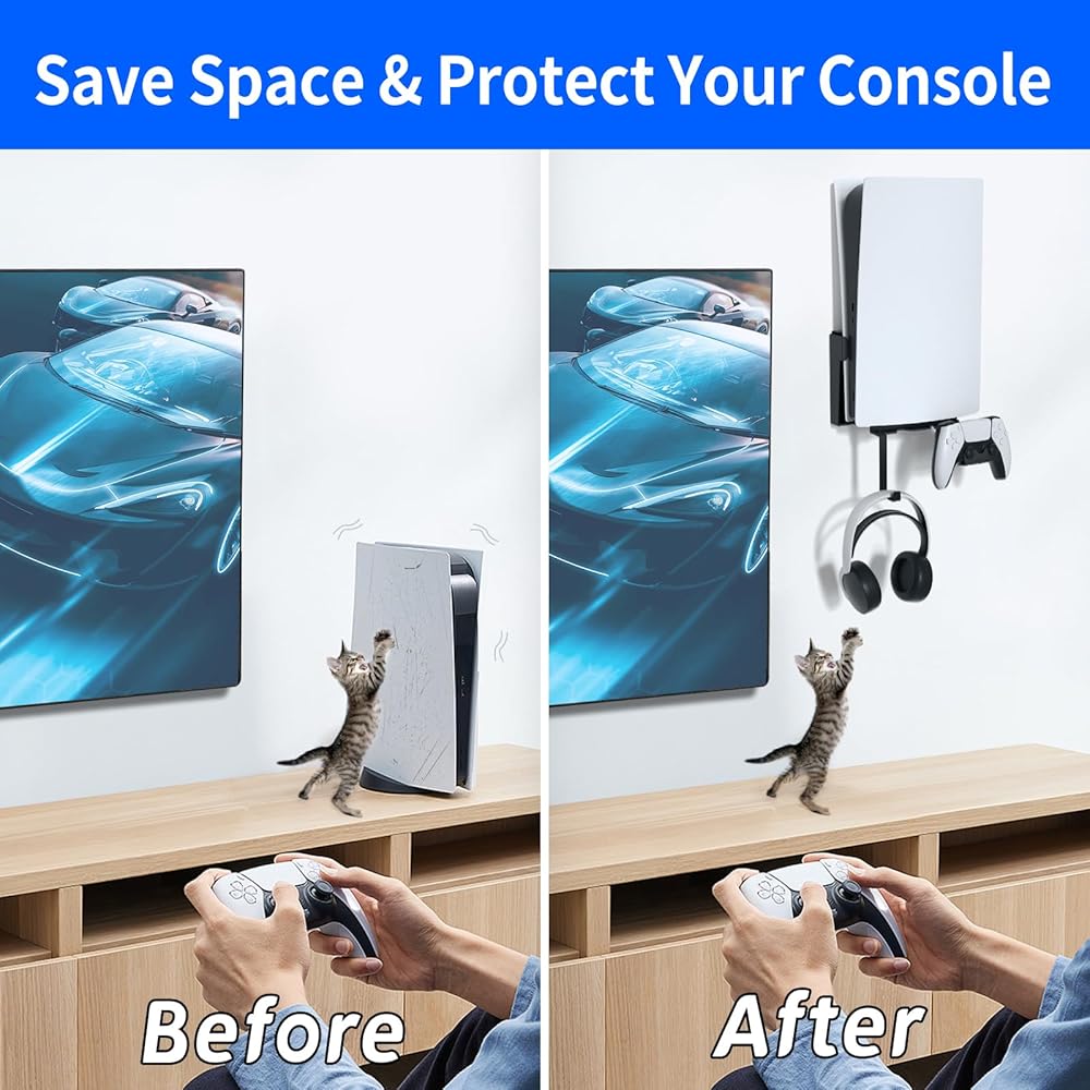 توفير المساحة والحماية: مع حامل وحدة التحكم القابل للفصل وشماعة سماعة الرأس، عن طريق تثبيت دعامة الحائط لجهاز PS5، ووحدة التحكم وسماعة الرأس أعلى مكتبك، يساعد على الحفاظ على منطقة الألعاب الخاصة بك منظمة ويقلل من خطر الاصطدامات أو تلف وحدة التحكم والملحقات الخاصة بك ، إطالة عمر خدمة المعدات.