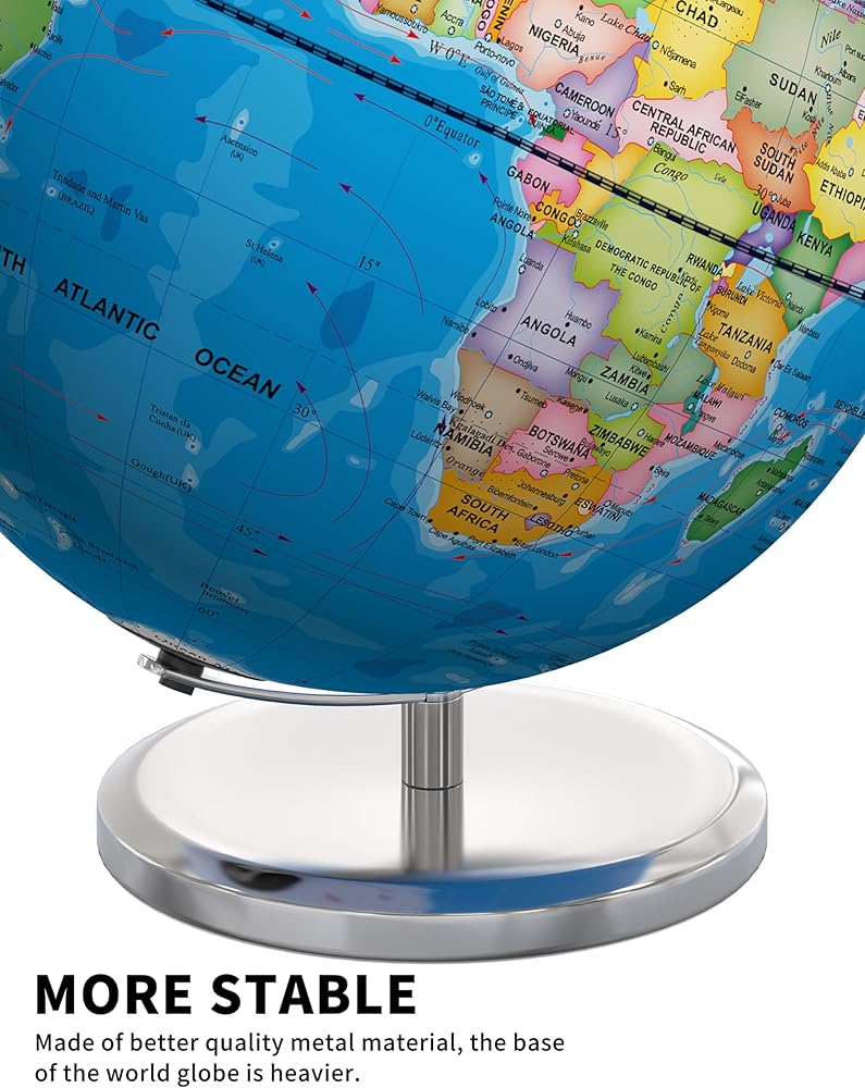 قاعدة معدنية قوية ومستقرة - الحامل الأساسي مصنوع من معدن عالي الجودة، حامل الكرة الأرضية أثقل وأقل تمايلًا عندما يقوم أطفالك بتدوير الكرة الأرضية. أقوى وأكثر استقرارًا من القاعدة خفيفة الوزن المصنوعة من البلاستيك.