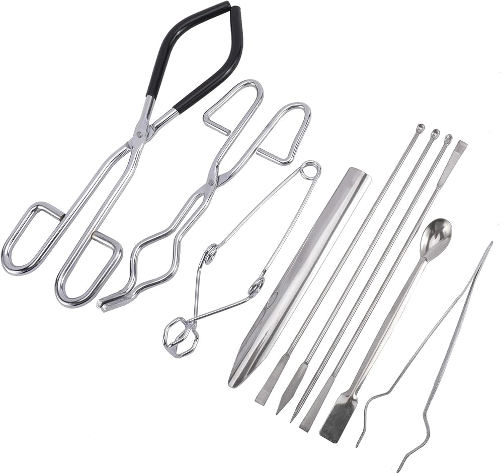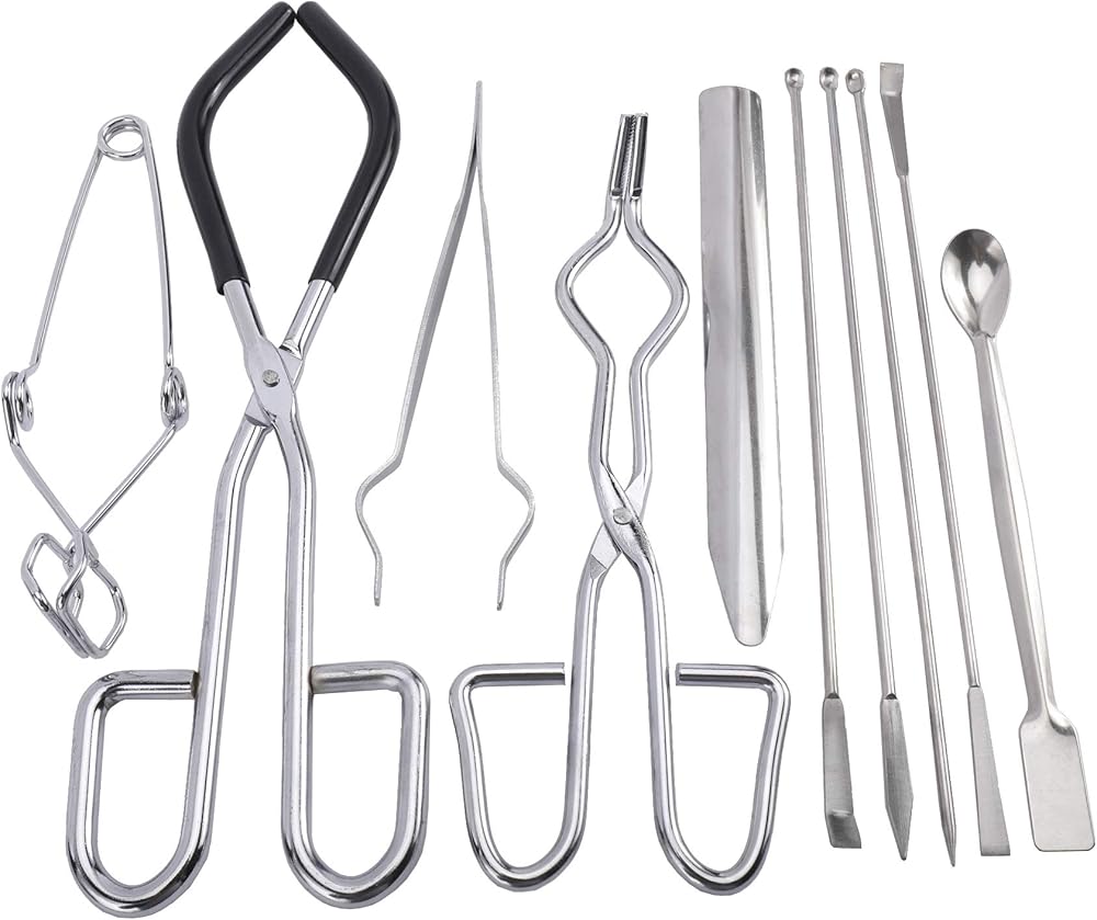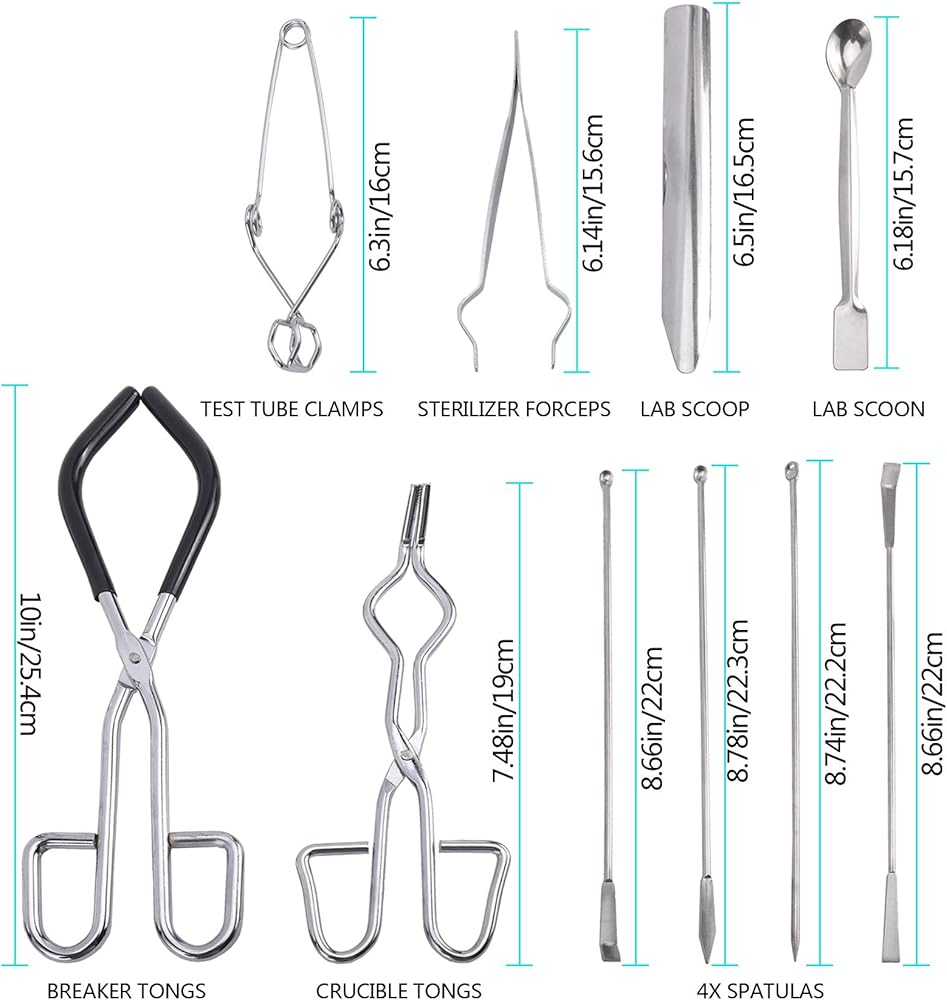 • 【Package Contents】: This Labwares Essential Lab Tool Starter Kit contains 10 PCS, Covering 1 × Breaker Tong, 1 × Crucible Tong, 1 × Test Tube Clamp, 1 × Sterilizer Forceps, 1 × Lab Spoon, 1 × Double-Head Lab Spoon, 4 × Double-Ended Spatulas.