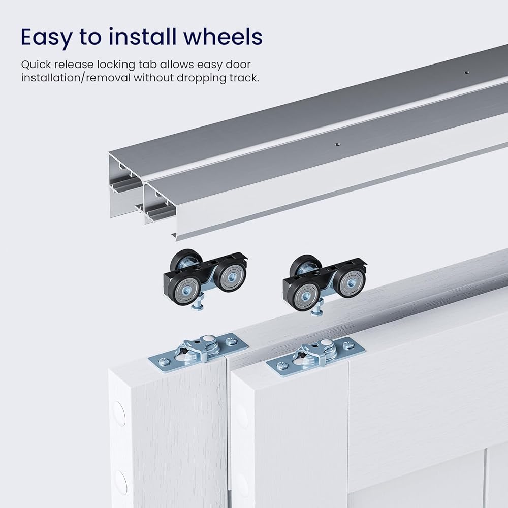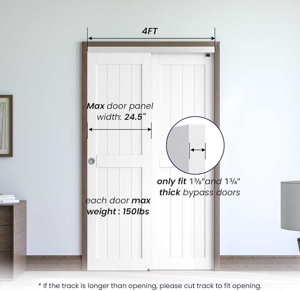 [المواصفات]: أقصى وزن لكل باب يصل إلى 180 رطل، عرض لوحة الباب المناسب: 24 1/2 بوصة (ملاحظة: الباب يحتاج إلى 1 بوصة متداخلة)، سمك لوحة الباب المناسب: 1 3/8 بوصة و1 3/4 بوصة . يمكن قطع المسار ليناسب عرض الفتح المخصص.