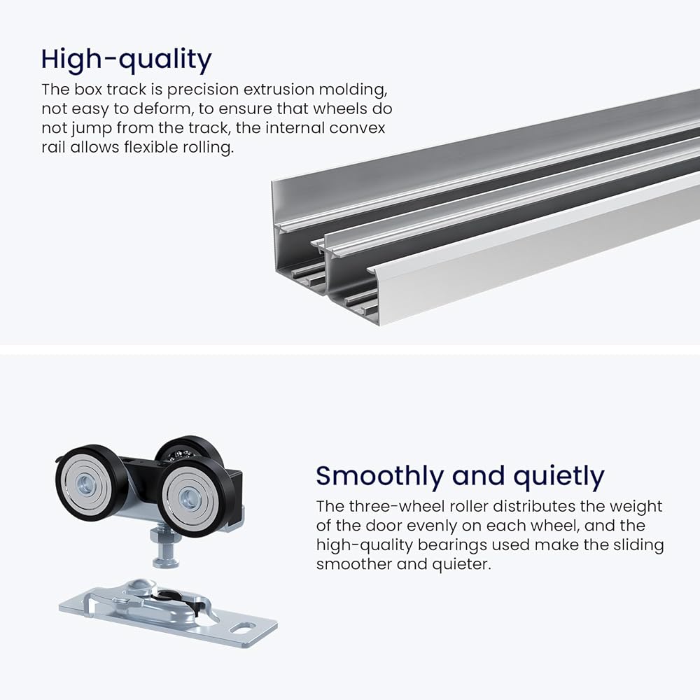 [متين وناعم]: طقم أدوات الباب المنزلق SMARTSTANDARD مصنوع من مادة سبائك الألومنيوم ليس فقط خفيف الوزن ولكن يتميز أيضًا بخصائص ممتازة للقوة العالية، مما يلبي احتياجات التركيب المريح والاستخدام طويل الأمد. التصميم المخفي، مقترن مع شماعات ذات ثلاث عجلات، تتمتع بقدرة تحمل قوية، وتشغيل سلس وهادئ