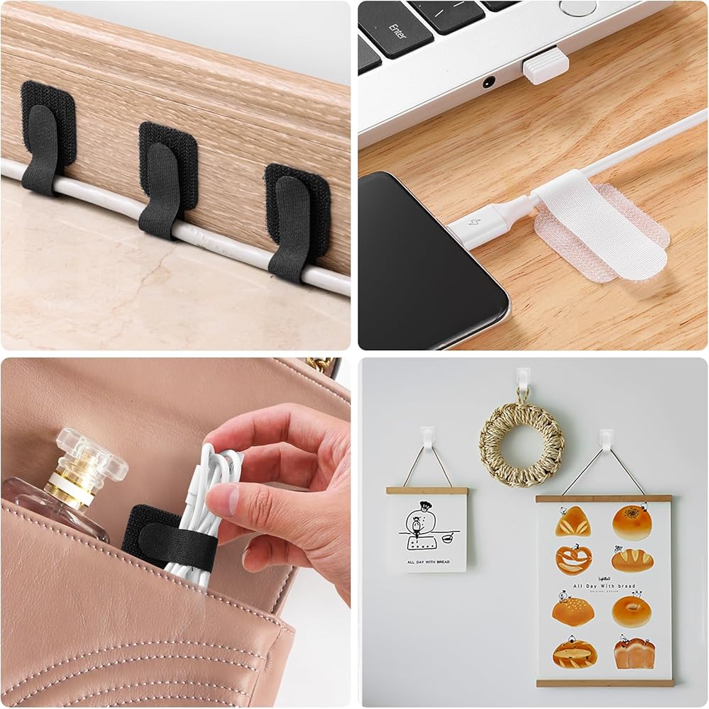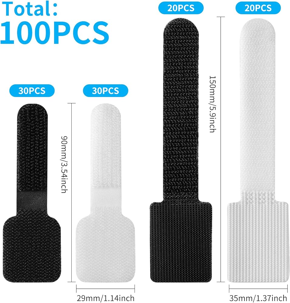 100 PCS Adhesive Cable Ties 4+6 inch Adjustable Cord Straps for Cable Management, Strong Cord Clips Wire Holders for The Wall, Under Desk, Christmas Lights, Electric Wires 2 Size L&S Black & White