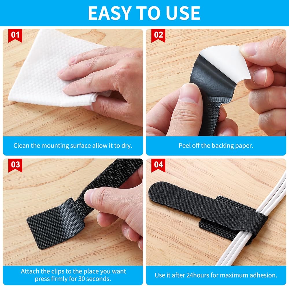 Note before Use: Make sure to clean the mounting surface with alcohol pads before you use the wire organizer clips, stick it on and press firmly for 30 seconds, and use them after 24 hours for maximum adhesion.