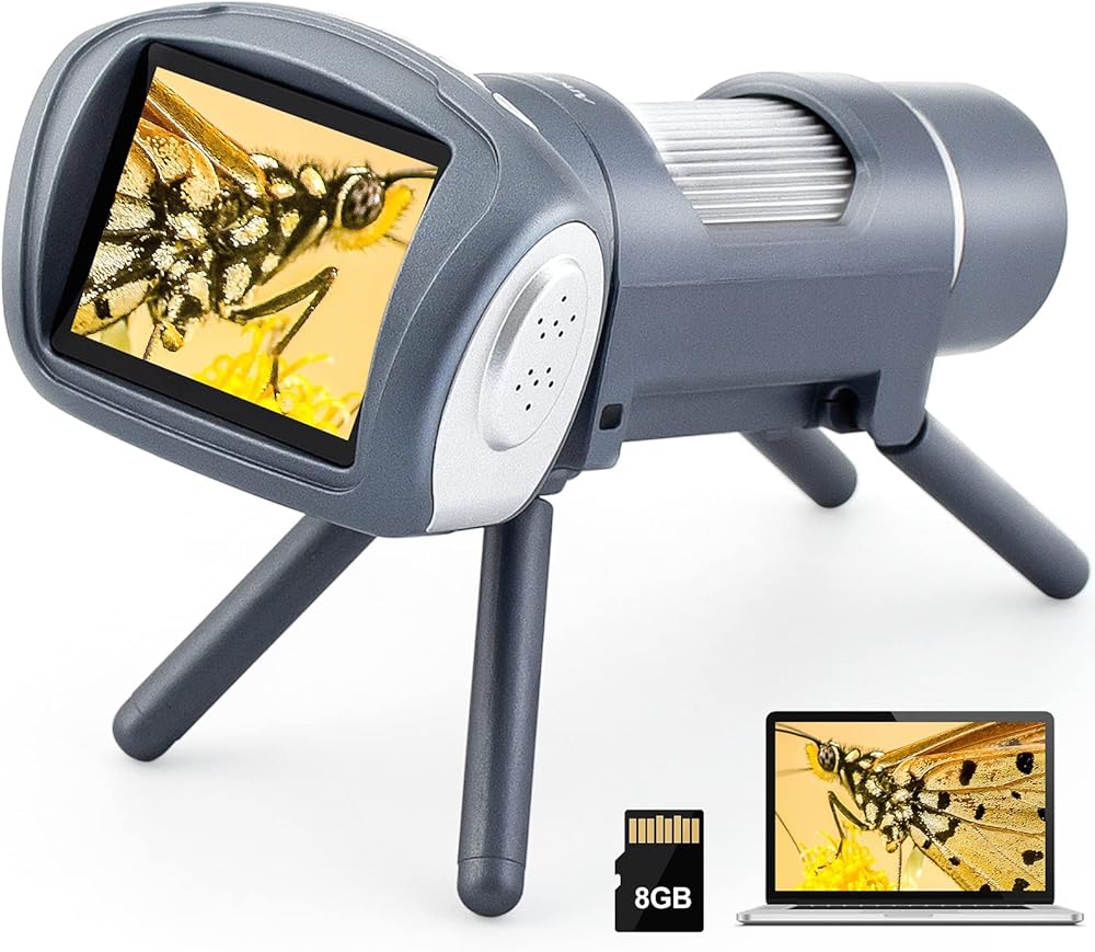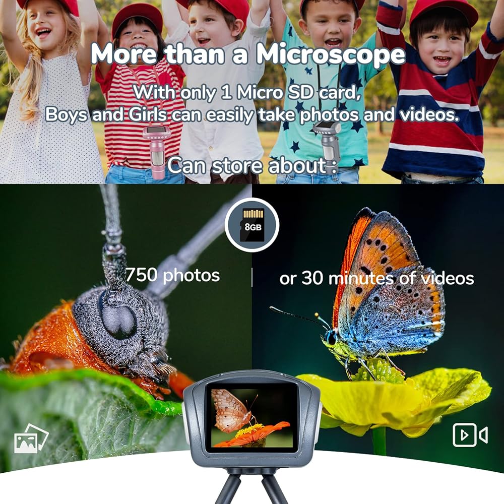 【كاميرا محمولة ومجهر فيديو للأطفال】ليس مجرد مجهر للأطفال. مع بطاقة Micro SD المتوفرة، يمكن للأطفال بسهولة التقاط وتخزين الصور أو مقاطع الفيديو الخاصة بالعالم الصغير الذي يلاحظونه، مما يجعلها لعبة تعليمية مسلية.