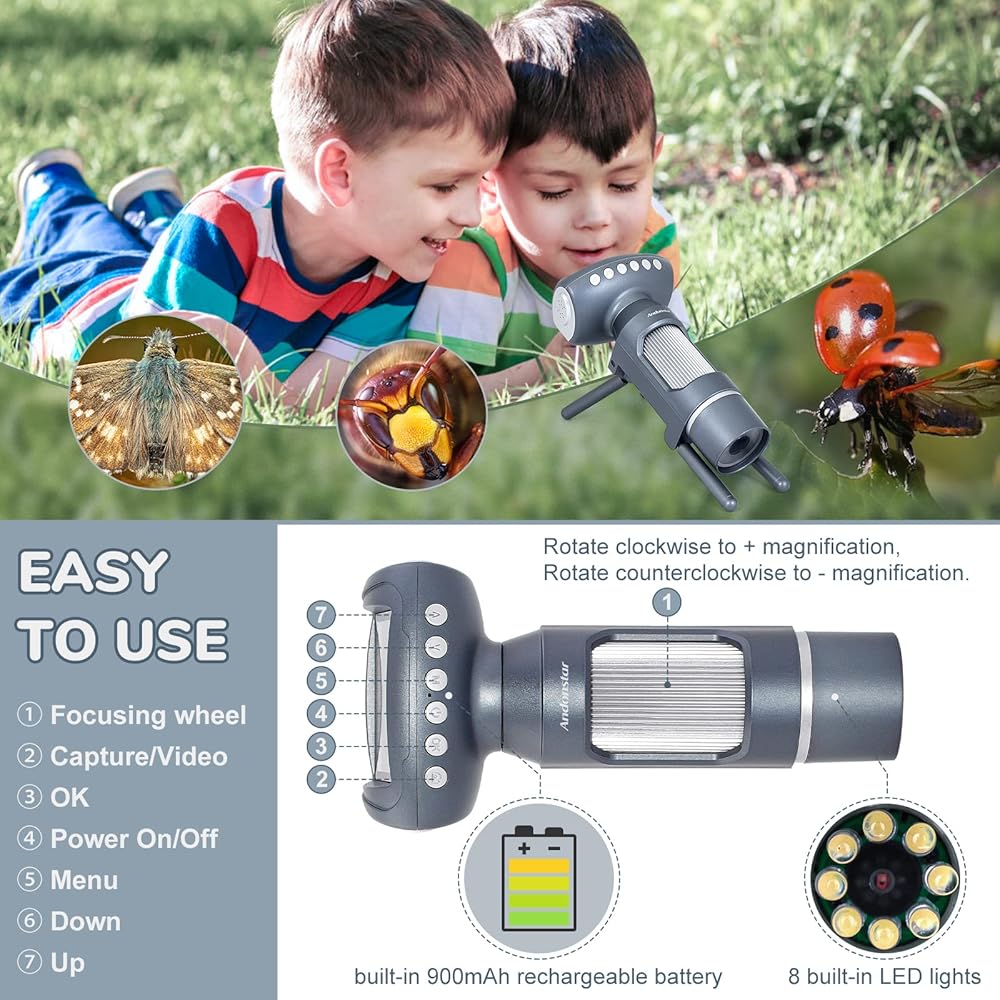 【لعبة STEM قابلة لإعادة الشحن ومحمولة】مع بطارية مدمجة قابلة لإعادة الشحن بقدرة 900 مللي أمبير في الساعة، يمكن للأطفال اصطحاب مجهر AD012 للأطفال إلى أي مكان لمراقبة الحيوانات الصغيرة الجميلة أو النباتات أو الذهاب للتخييم أو التسلق. مما يمكن أن يزيد من اهتمام الأطفال بالعالم الطبيعي.