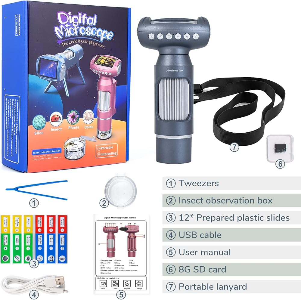 مجموعة مجهر محمول Andonstar AD012 للأطفال، مجهر LCD للأطفال مقاس 2 بوصة مع شرائح مُجهزة، بطاقة SD 8 جيجا، متوافقة مع أجهزة الكمبيوتر التي تعمل بنظام Windows، ألعاب تعليمية STEM للاستخدام الداخلي والخارجي، للأعمار من 5 سنوات فما فوق (رمادي)