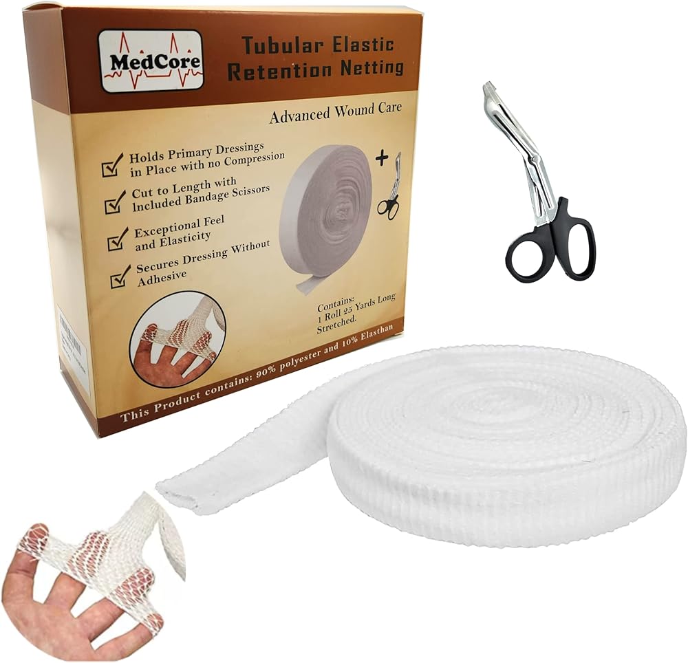 【PACKAGE INCLUDES】 1 roll of elastic tubular wide mesh net bandage plus one pair of Medical Shears to cut to desired size. Roll is 10 Yards long. Use to secure ointment dressing pads, requires no tape or pins needed.