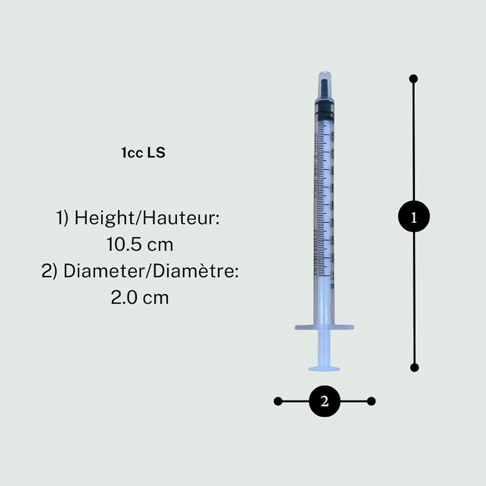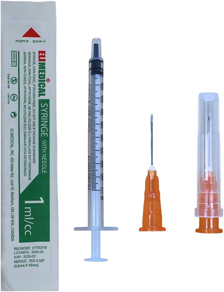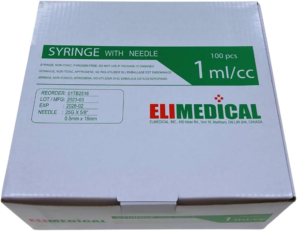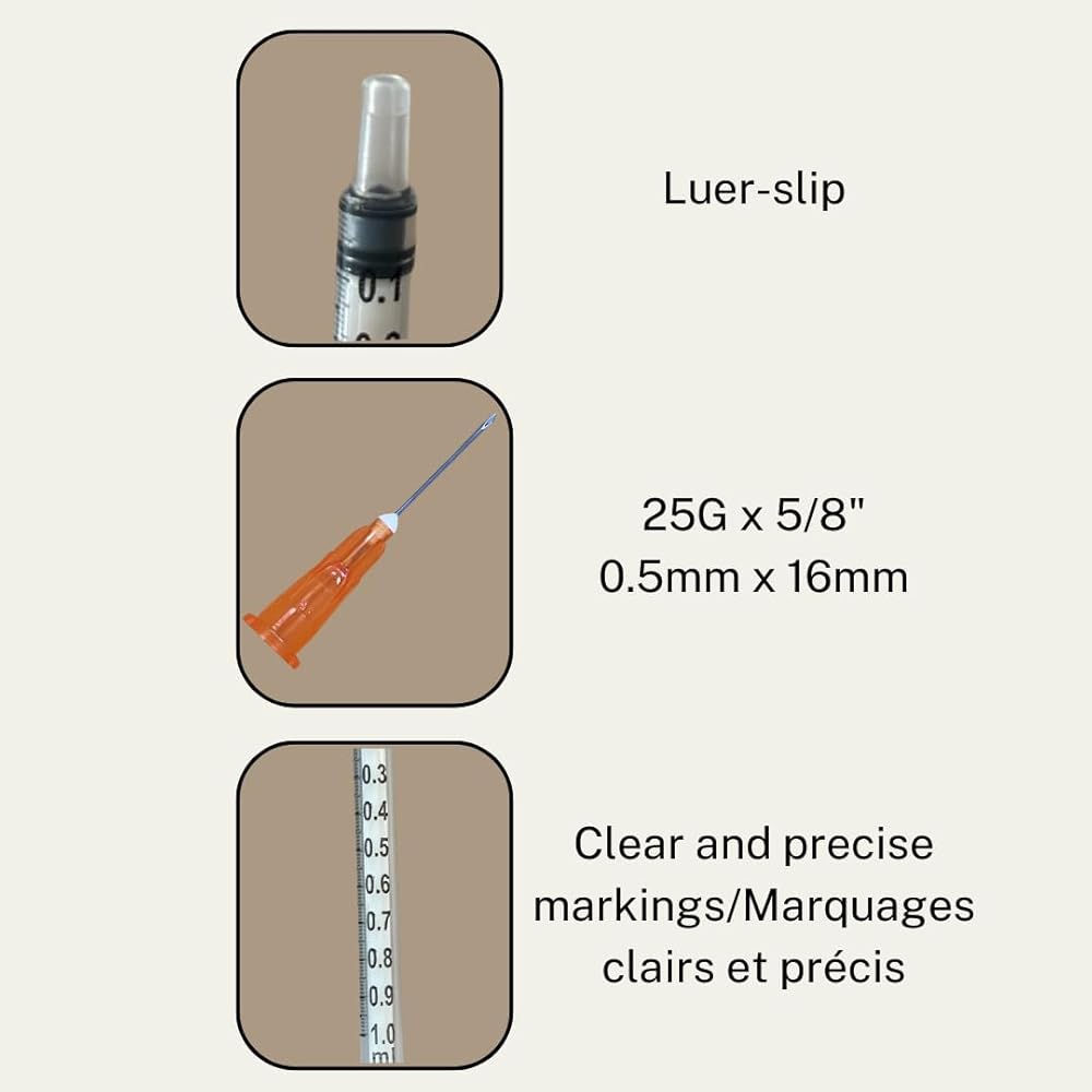 • SIZE: 1cc syringe with 25-gauge 5/8 inch needle. Luer slip syringe end. Box of 100 individually sealed units.