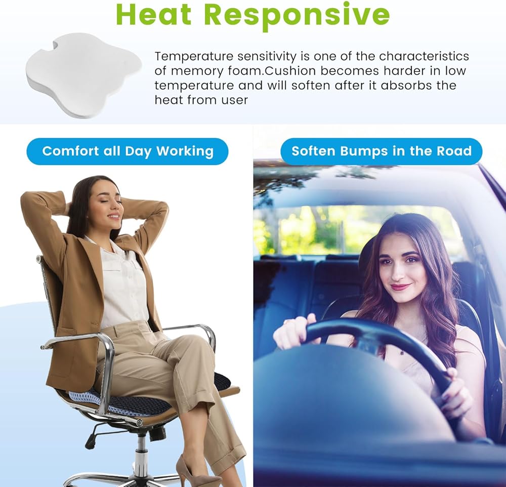 استجابة للحرارة: حساسية درجة الحرارة هي إحدى خصائص الإسفنج الذكي. تصبح وسادة المقعد أكثر صلابة في درجة الحرارة المنخفضة وستلين بعد أن تمتص الحرارة من المستخدم. عند استخدامها لأكثر من عشر دقائق، ستشعر بوسادة المقعد بأكملها بلطف دعم الأرداف والفخذين. إذا كنت تقود السيارة، فسوف تخفف من مطبات الطريق، وإذا كنت تعمل لفترة طويلة، فسوف تقضي على التنميل في الأرداف.