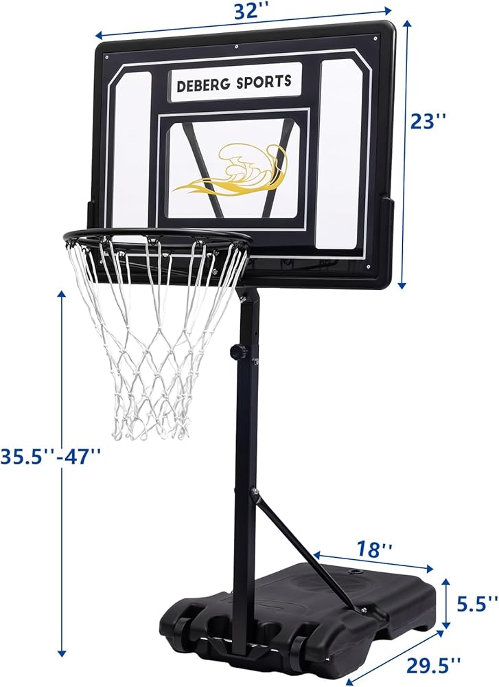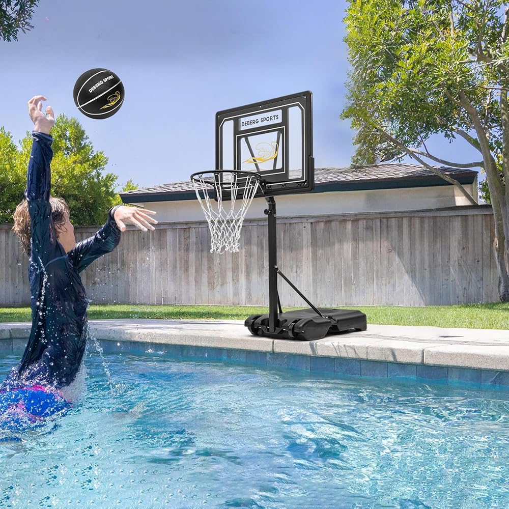 DEBERG Pool Basketball Hoop بجانب المسبح 3-4ft ارتفاع قابل للتعديل مجموعة أهداف كرة السلة المحمولة لحمام السباحة مع عجلات ولوحة خلفية مقاومة للكسر، تتضمن كرة سلة ومضخة هواء