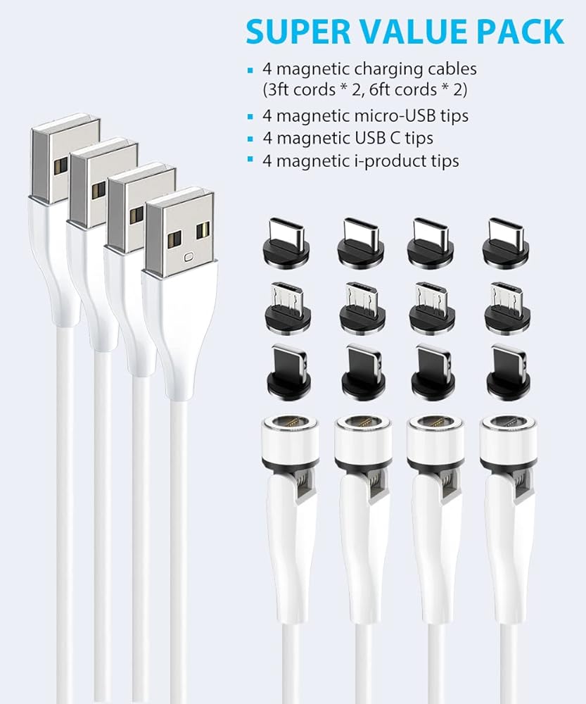 حزمة قيمة فائقة - تتضمن 4 كابلات شحن مغناطيسية (أسلاك بطول 3 أقدام * 2، أسلاك بطول 6 أقدام * 2)، 4 أطراف USB مغناطيسية صغيرة، 4 أطراف USB C مغناطيسية، و4 أطراف مغناطيسية للمنتج i. يتم دعم كل عملية شراء بضماننا القوي لمدة 12 شهرًا.