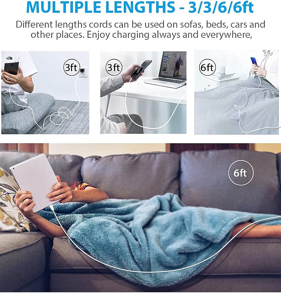 أطوال متعددة - 3 أقدام/6 أقدام - يمكن استخدام أسلاك بأطوال مختلفة على الأرائك والأسرة والسيارات وغيرها من الأماكن. استمتع بالشحن دائمًا وفي كل مكان، دون القلق بشأن اصطحاب الكابل إلى أي مكان.