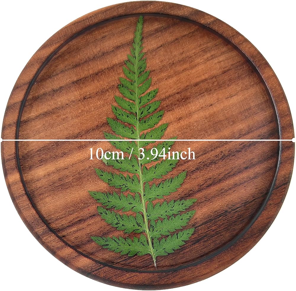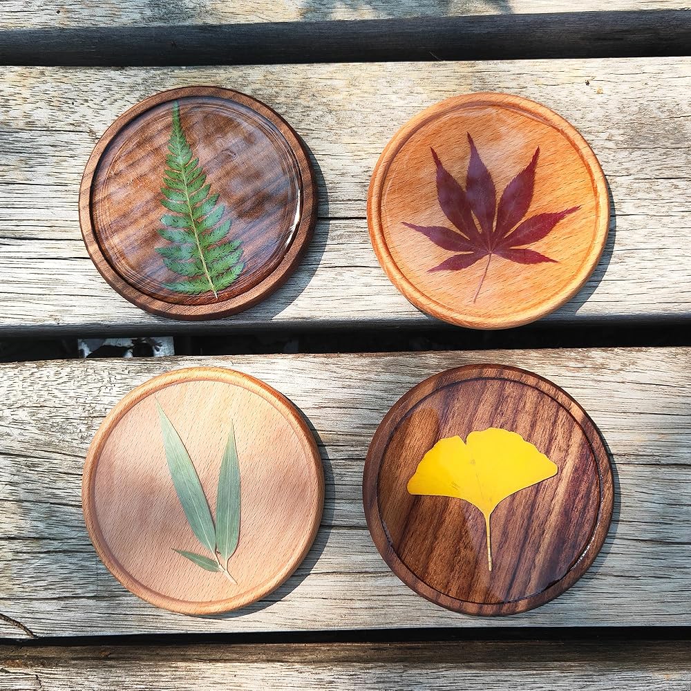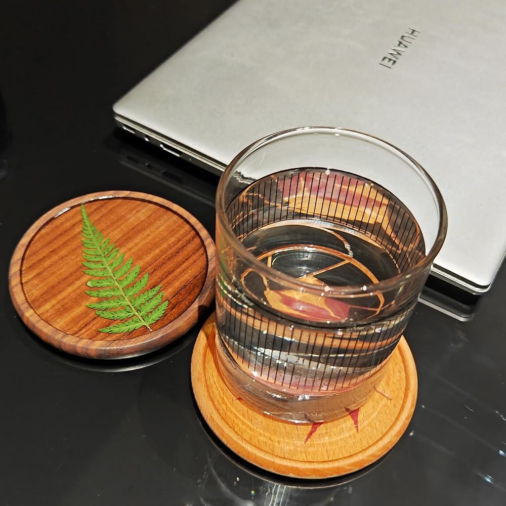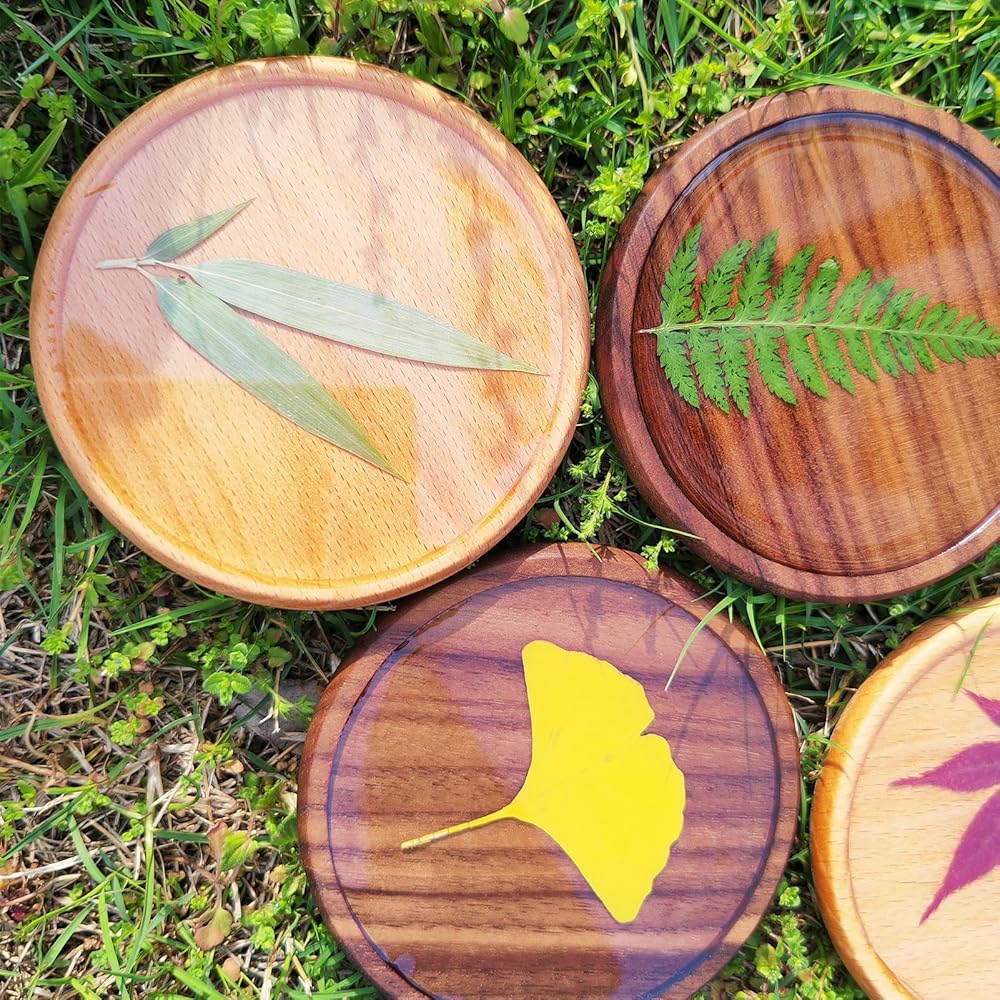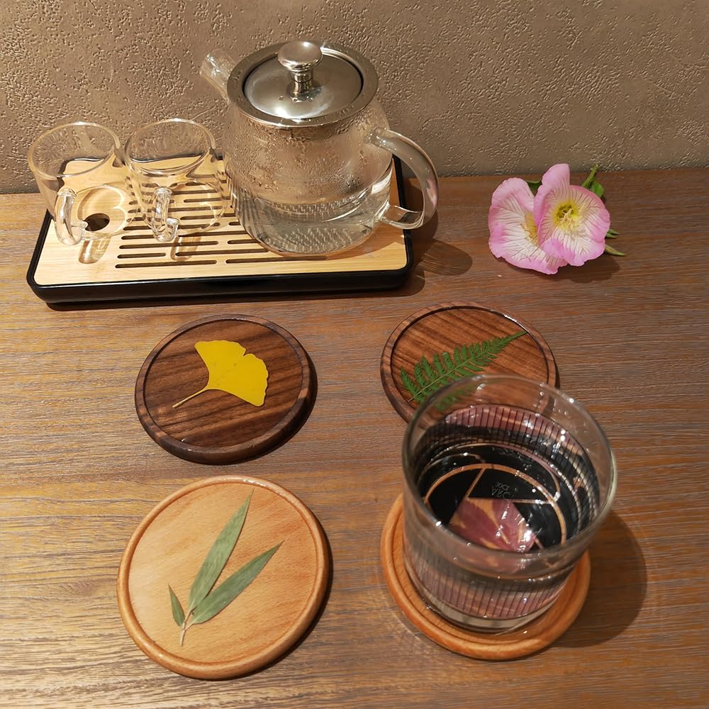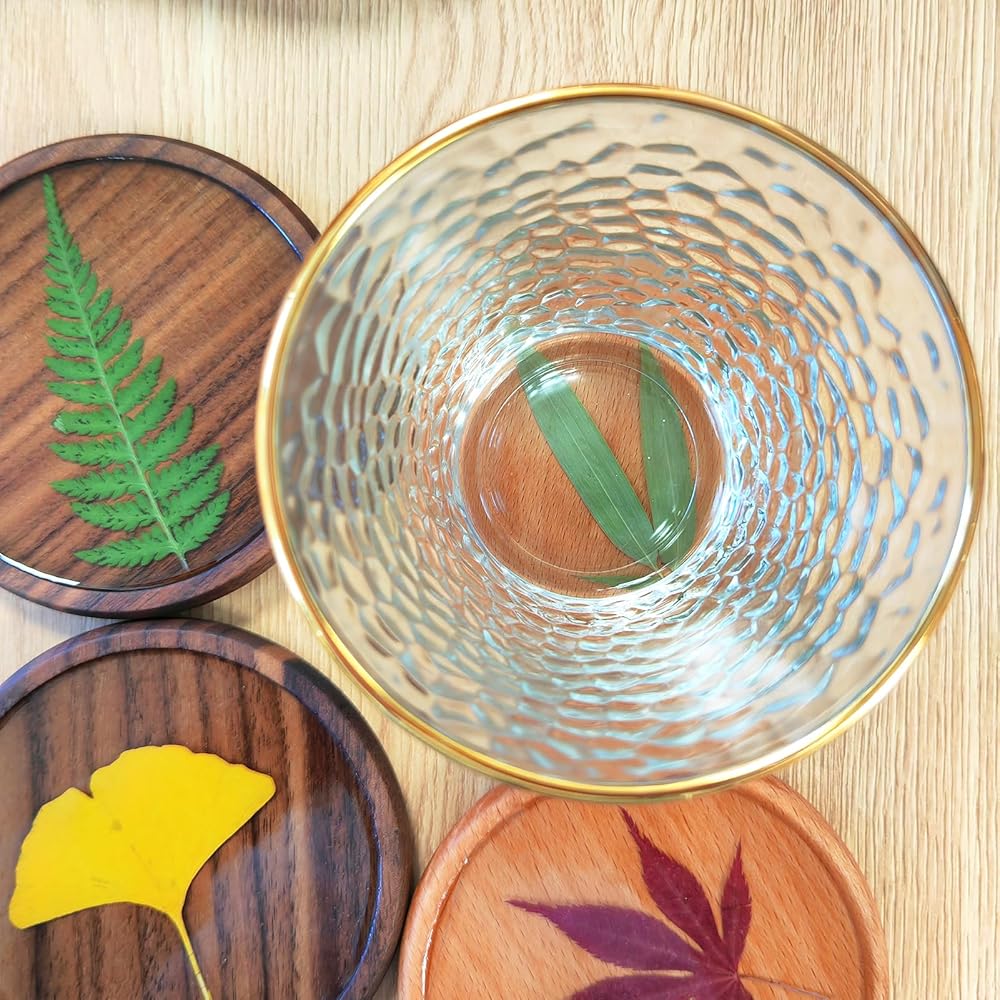 They were handmade out of dry leaves(Bamboo leaf, Maple leaf, Ginkgo leaf, Fern leaf), resin and wood. These coasters are 4 inches round, and easily hold wide cups.