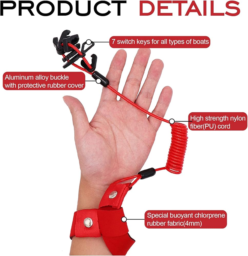 السمات: حبل مفتاح القفل أحمر ساطع، ملفوف، مصنوع من سلك بولي يوريثان عالي القوة، متصل بإبزيم من سبائك الألومنيوم يمكن أن يجعل الحبل أكثر متانة. لا تقم بتشغيل القارب الخاص بك بدون حبل مفتاح الإيقاف المتصل بسائق/مشغل القارب.