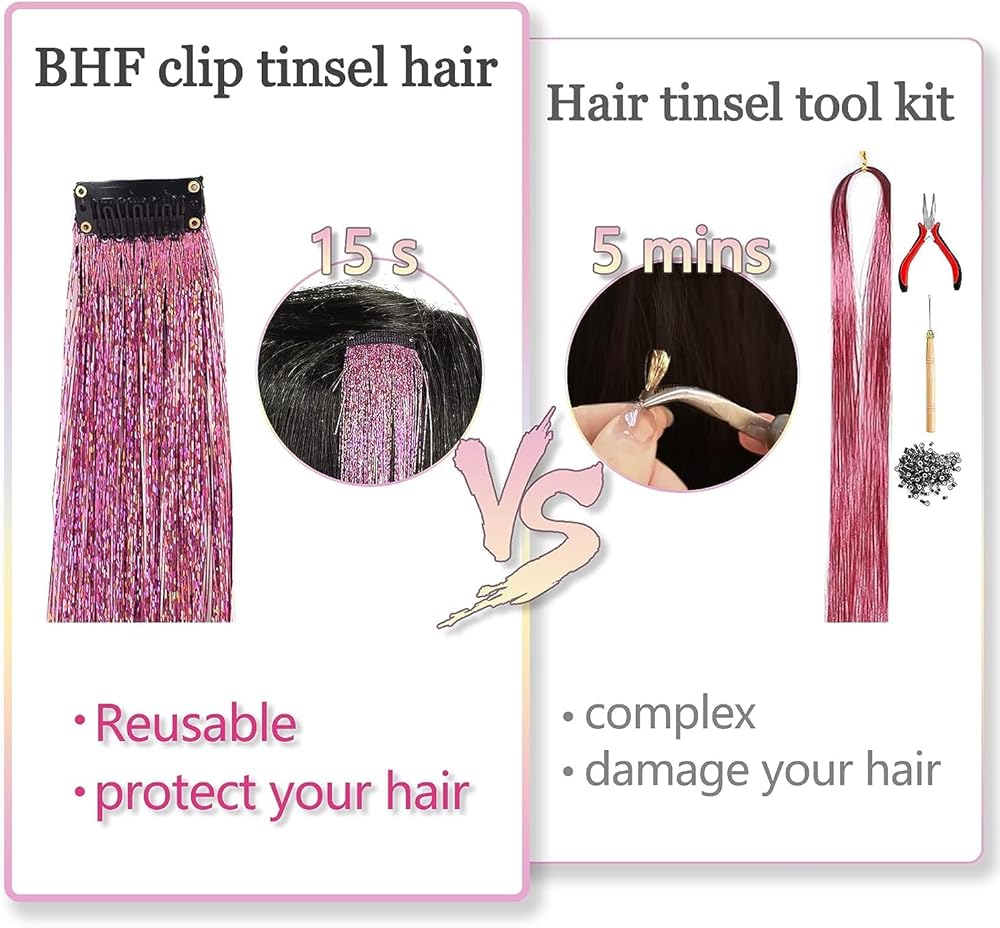 سهل الارتداء وثابت: وصلات الشعر بتينسل من بي إتش إف هي أحدث منتج للتصميم، حيث قامت بي إتش إف بترقية لون الشعر، وأضافت تصميم المشبك على طرف الشعر، وحسّن من نقص بذر الشعر الذي ليس سهل الارتداء وسهل الارتداء، فإنك لا تحتاج إلى أدوات ومهارات، ولن تؤذي شعرك. احصلي عليه في 3 ثوان واحصل على تسريحة شعر جديدة جميلة، وفر الوقت.