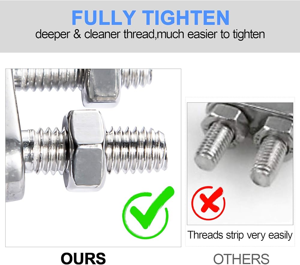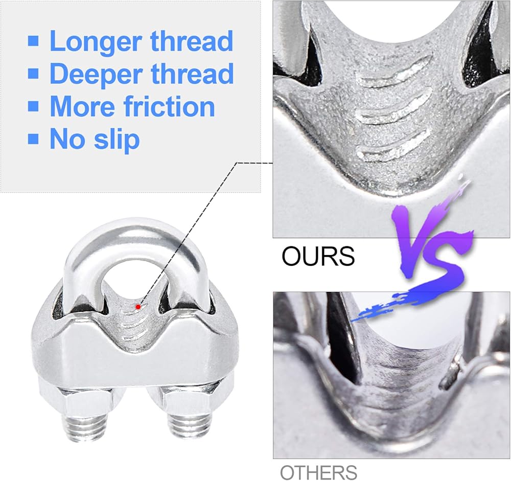 • Cleaner& Deeper Threads: different from other 98% wire rope cable clip clamps, a cleaner & deeper thread, plus the sharp teeth, these guarantee the nuts will not stuck, give you a perfect tighten.