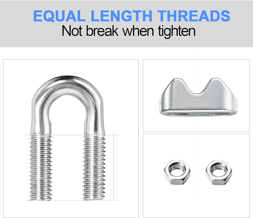 • Equal length threads:you will feel disappoint if the clamps can not hold the metal cable securely, uneven thread is the main reason. So, we increased a inspection procedure for every clamps to make sure they have a equal length threads, what you get will fit well and enable the nuts to move smoothly and tighten securely.