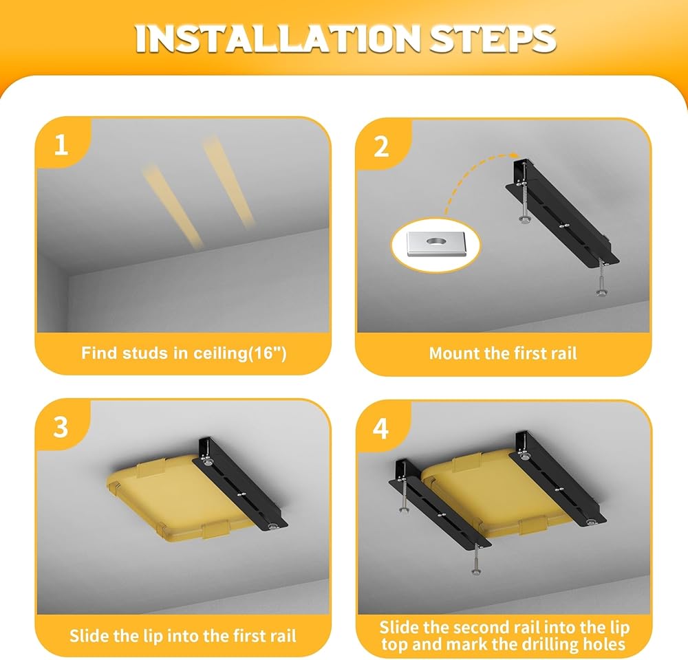 • تخزين علوي بدون جهد: يتم تثبيت نظام تخزين حمل المرآب بشكل آمن على مفاصل السقف مقاس 16 بوصة للتركيب السريع والخالي من المتاعب. قضبان تخزين حمل السقف تناسب الصناديق المشتركة (الصناديق غير متضمنة) للتخزين السريع والسهل.