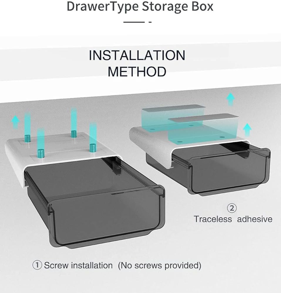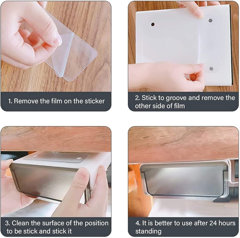 سهلة التركيب للغاية: ما عليك سوى استخدام المواد اللاصقة المرفقة لإلصاقها على أي لوحة ناعمة مثل المكتب والخزانة وطاولة الزينة وخزانة الملابس وما إلى ذلك. تأتي مع تعليمات الاستخدام. لتثبيت الدرج بإحكام، يرجى الانتظار لمدة 24 ساعة قبل الاستخدام. بالإضافة إلى ذلك، مصممة بأربعة فتحات لتثبيتها بواسطة البراغي (لا تشتمل على المسمار).