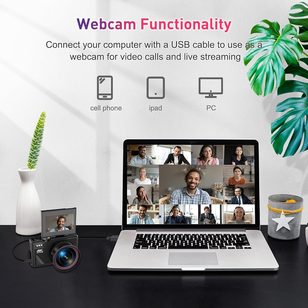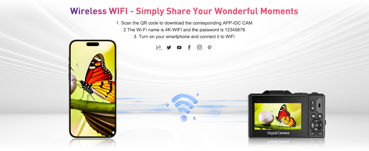 وظيفة اتصال WIFI وUSB لاسلكية: تتيح لك وحدة WIFI اللاسلكية المدمجة في الكاميرا استخدام هاتفك المحمول لمشاركة مقاطع الفيديو والصور عبر الإنترنت على الفور. يمكنك استخدام تطبيق "iDC CAM" للتصوير والضبط والمعاينة في الوقت الفعلي والتشغيل وغيرها من الوظائف، مما يسهل عملية التشغيل بشكل كبير. استخدم كابل USB للتوصيل بالكمبيوتر، وستظهر كاميرا wifi الرقمية واجهة نقل البيانات، مما يجعل من السهل نقل الصور ومقاطع الفيديو إلى الكمبيوتر بنقرة واحدة.