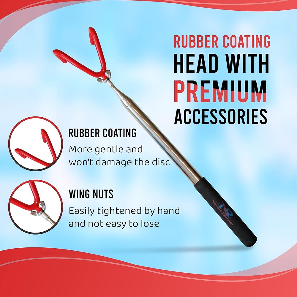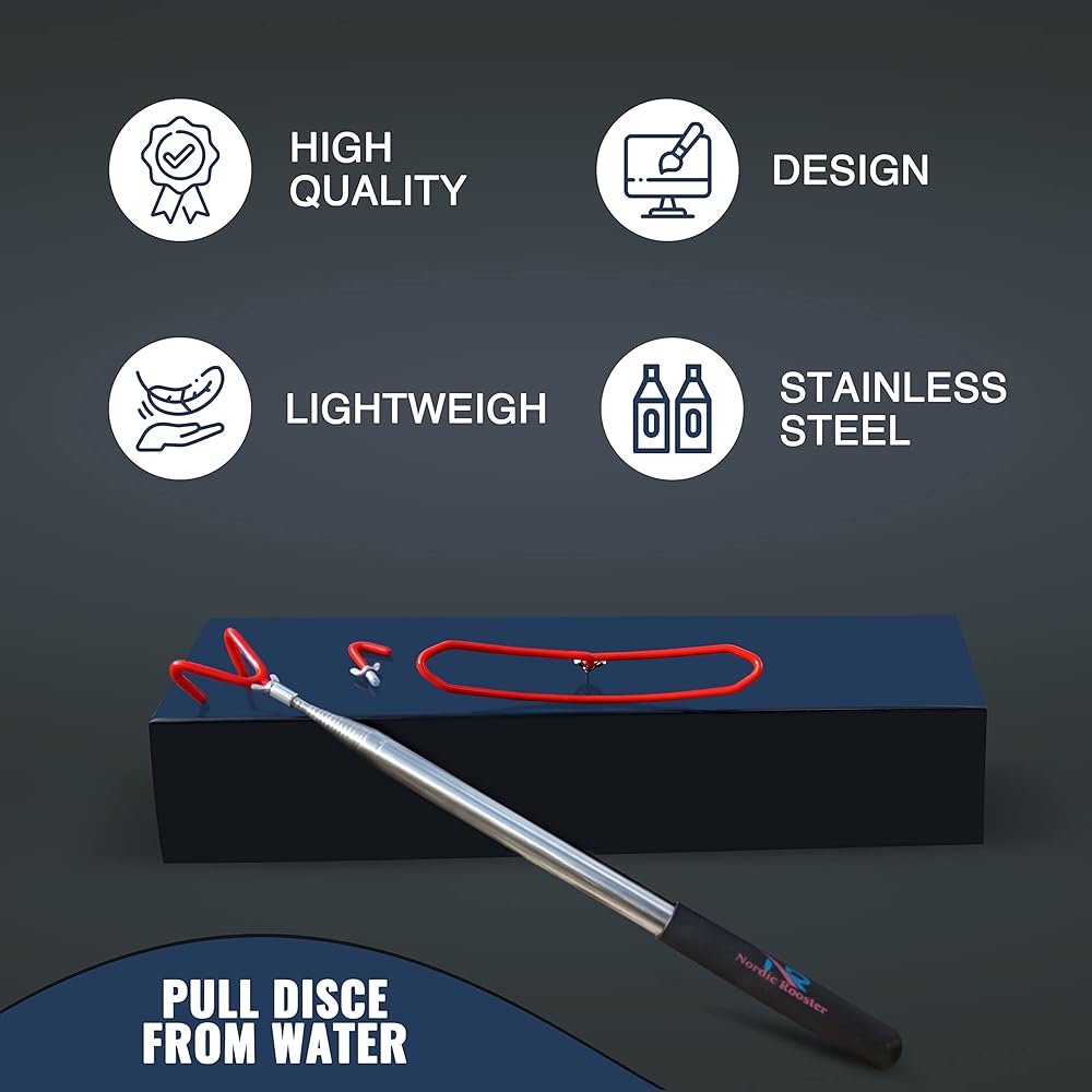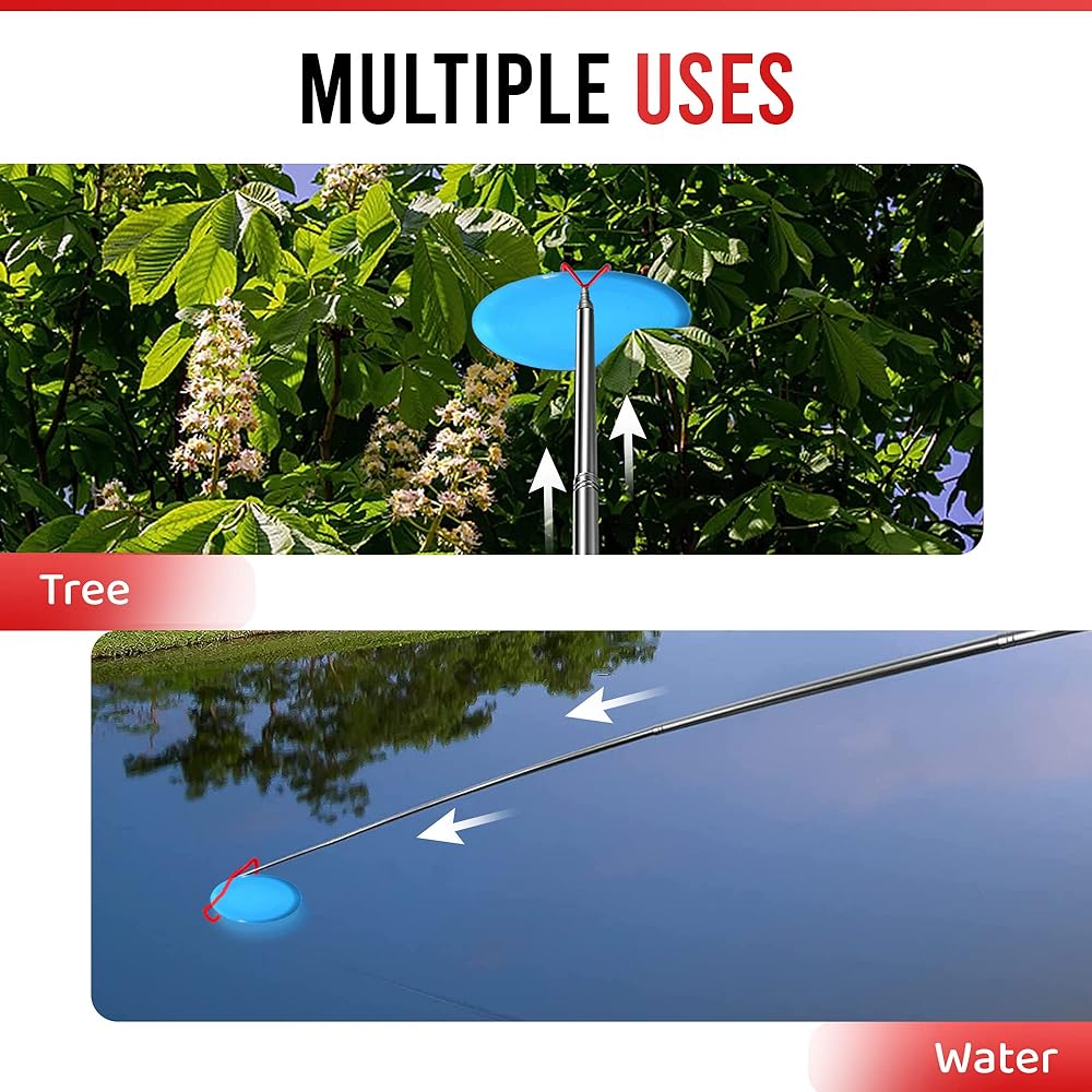 قرص جولف بطول 16 قدم - عصا مصنوعة من الفولاذ المقاوم للصدأ المقاوم للتآكل، مصممة ببنية ممتازة، ستبقى ثابتة حتى عند تمديدها حتى 16 قدم. قوية ودائمة. سواء تم سقوط قرص الجولف الخاص بك في الماء أو عالقًا في شجرة، يمكن أن يساعدك مسترد قرص الجولف في استعادة القرص الخاص بك.