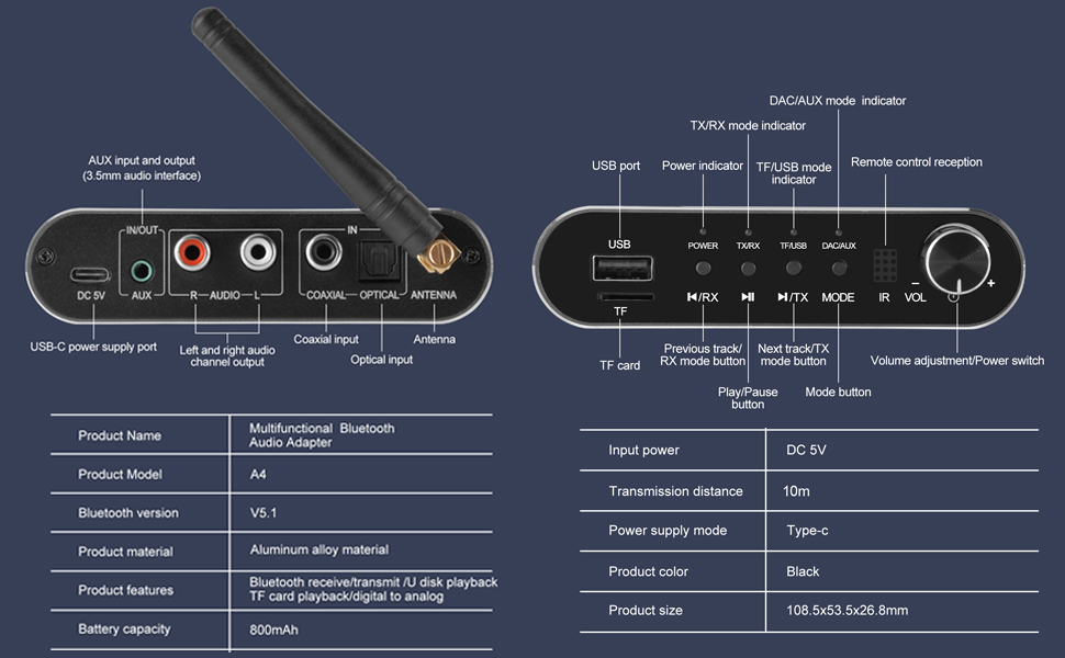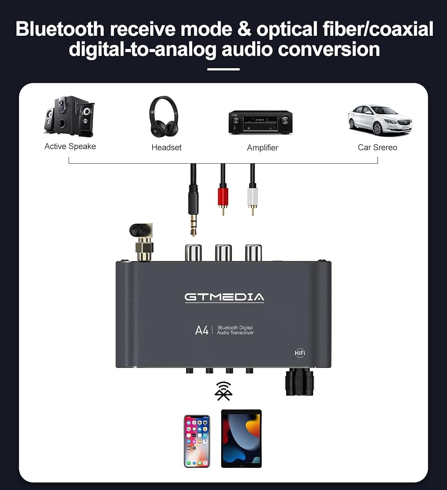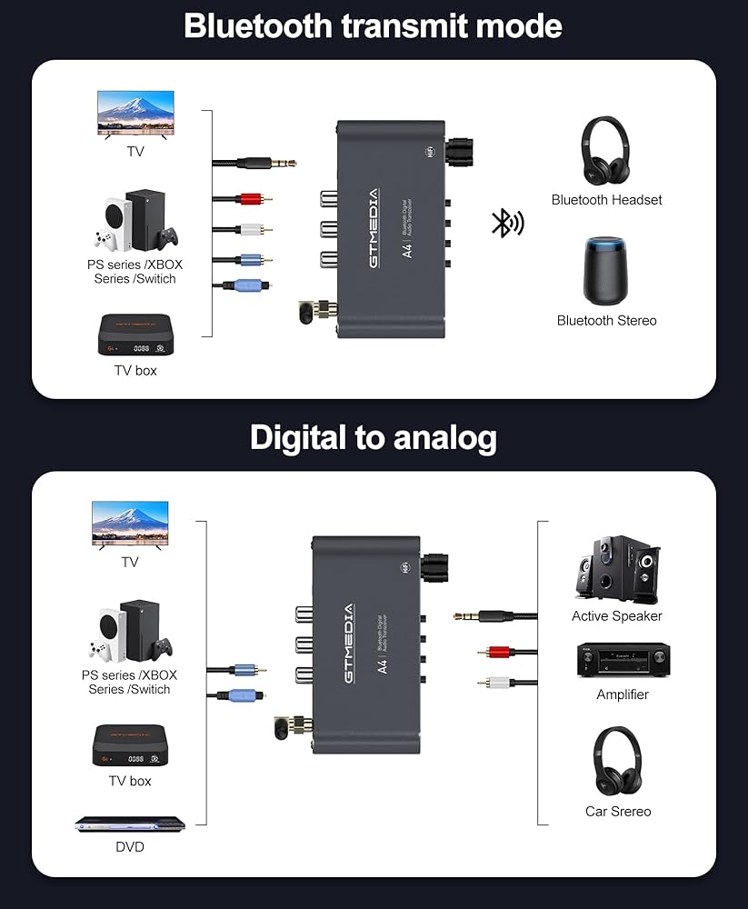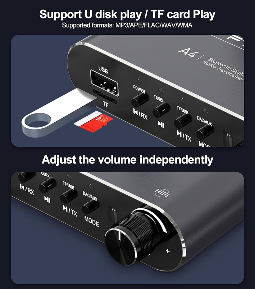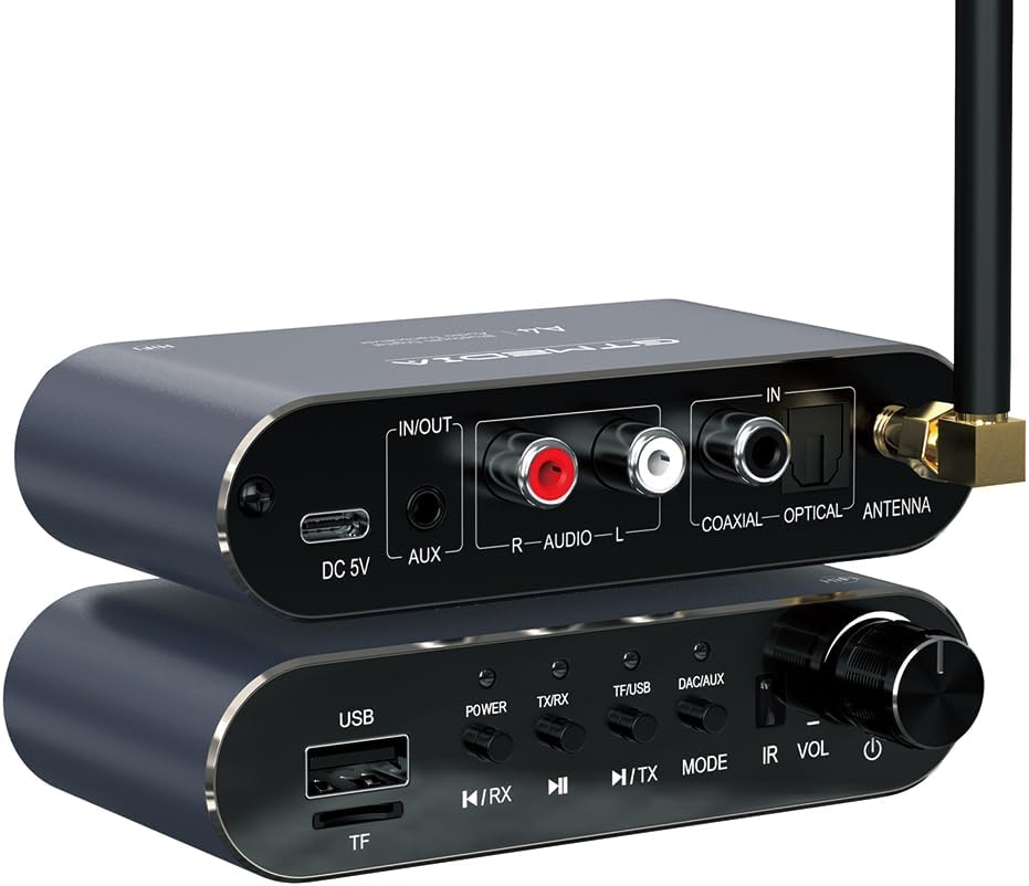 جهاز استقبال وجهاز إرسال بلوتوث 2 في 1: قم بالتبديل بين وضع الاستقبال (Rx) لتشغيل الموسيقى من الهواتف/الأجهزة اللوحية على مكبرات الصوت السلكية، ووضع الإرسال (Tx) لنقل الصوت من الأجهزة غير المزودة بتقنية البلوتوث إلى سماعات الرأس/مكبرات الصوت التي تعمل بتقنية البلوتوث.