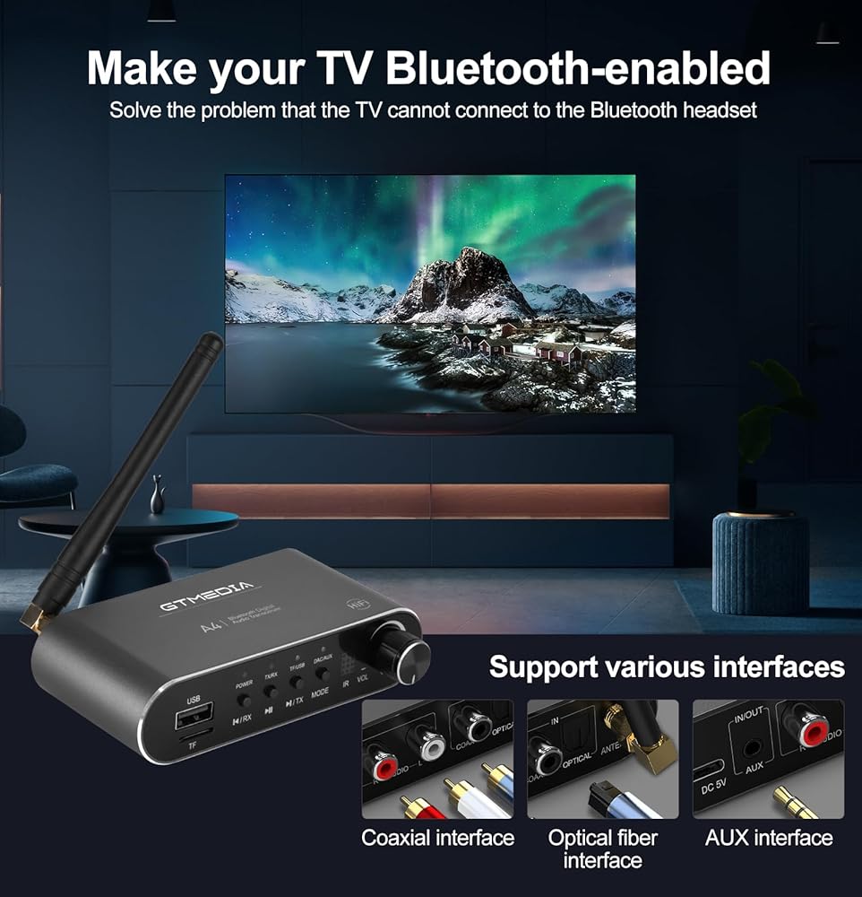 جهاز إرسال بلوتوث ipremium للتلفزيون، جهاز إرسال واستقبال محول صوت بلوتوث هاي فاي مع AUX 3.5 مم، RCA محوري، بصري، بطاقة TF، مخرج محرك فلاش USB للسيارة، ستيريو منزلي، سماعات الرأس، مكبر الصوت