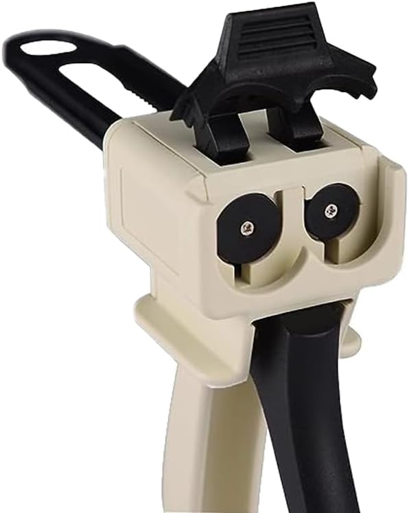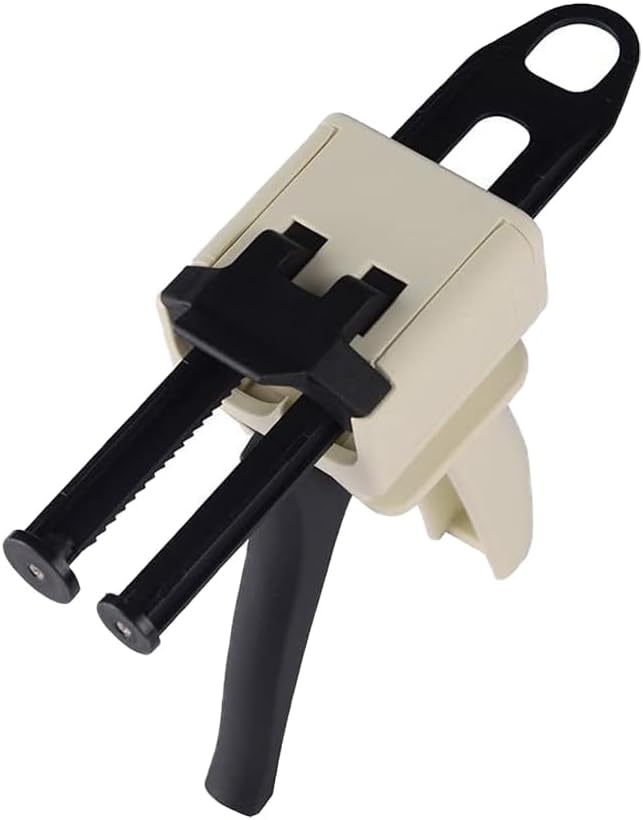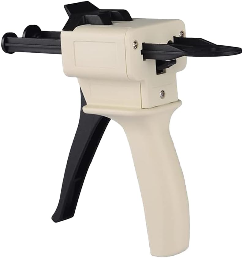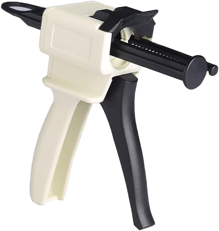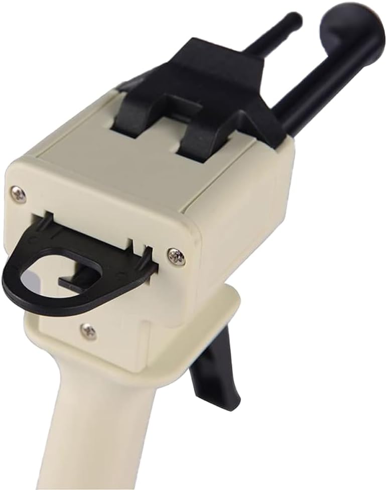 The dental impression gun can be slid in and held firmly in place with a lever, and squeezing the handles together can dispense mixed adhesives smoothly