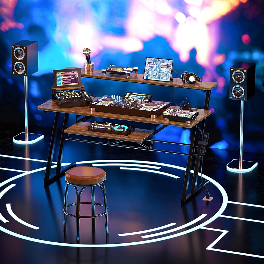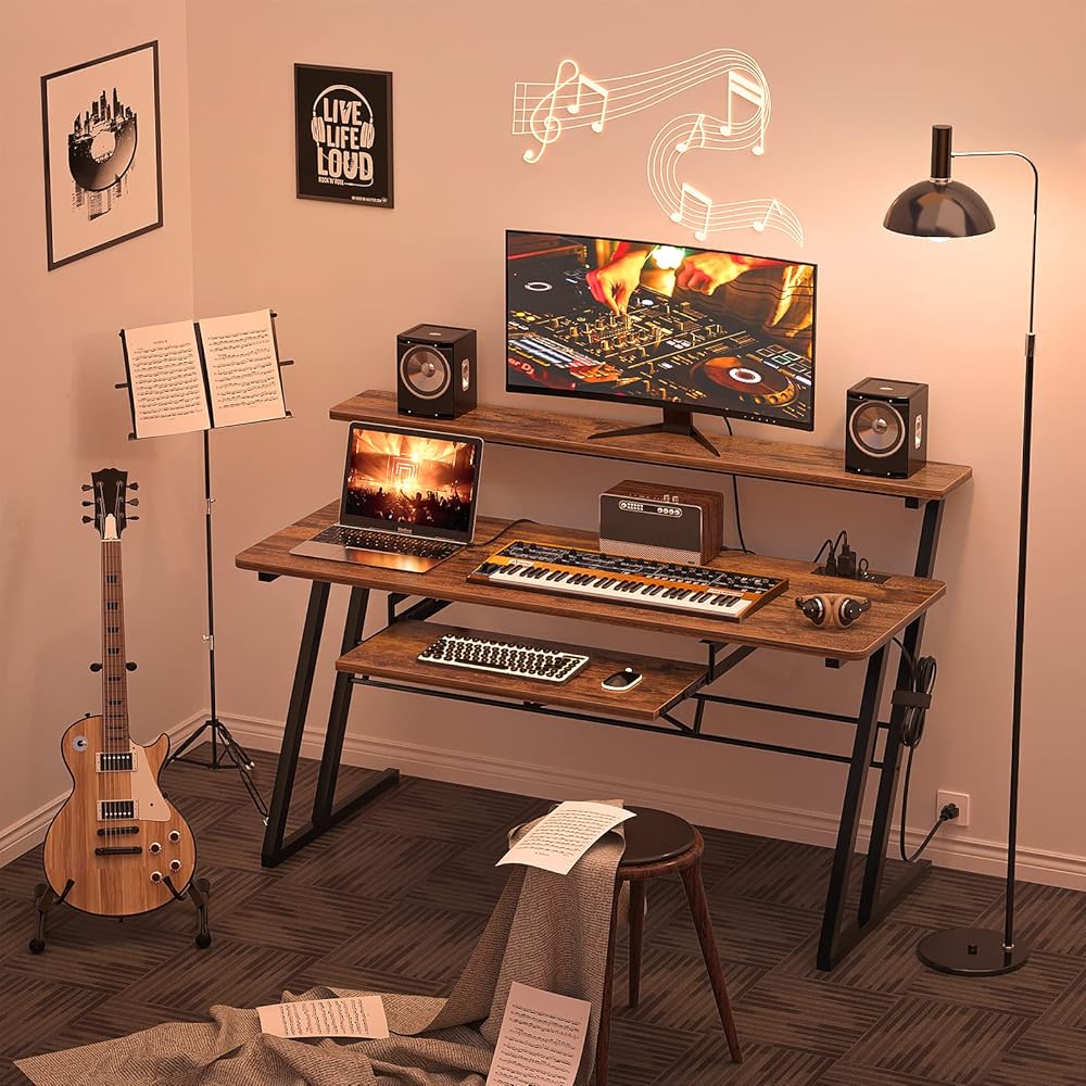 مكتب استوديو موسيقى AC-47 بوصة مزود بمنفذ طاقة، مكتب استوديو لإنتاج الموسيقى، مكتب استوديو تسجيل للمنتج، مكتب محطة عمل استوديو لتسجيل الموسيقى، صينية البيانو، حامل مرتفع، بني ريفي