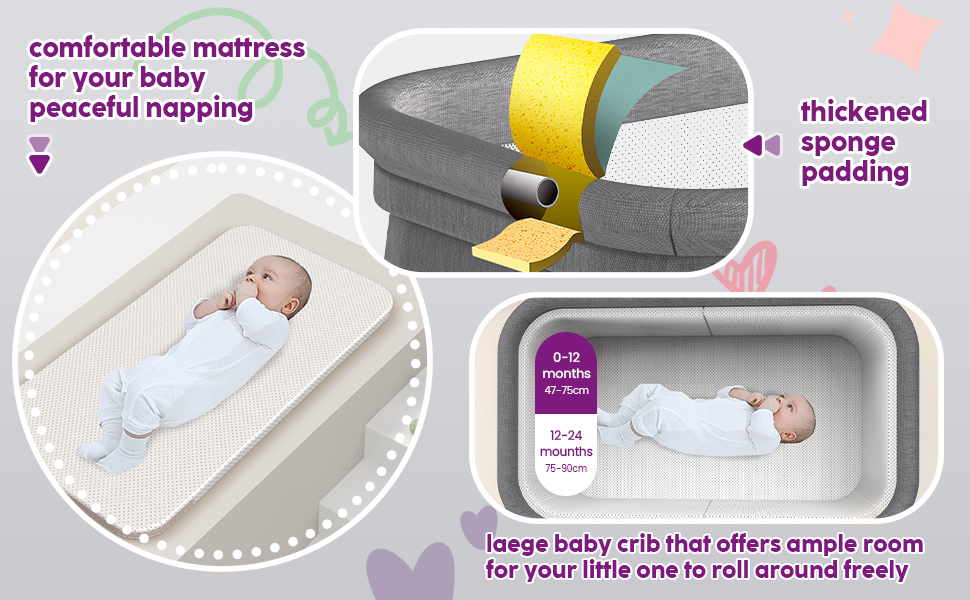 【سلامة المواد】 ①. يتميز سرير الأطفال المحمول الخاص بنا بقماش الكتان الناعم والآمن. تصميم السحاب يجعل من السهل إزالة وتنظيف غطاء المرتبة وأقمشة سرير الأطفال. ②.كن من السهل معرفة أن سرير الأطفال SEJOY الخاص بنا مصمم بسطح نوم ثابت ومسطح. لجنة سلامة المنتجات الاستهلاكية. سلامة طفلك ورفاهيته هي أهم أولوياتنا.