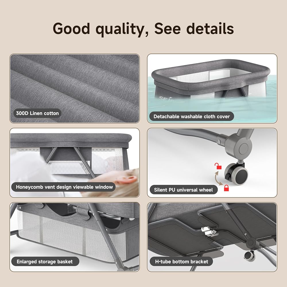 【مصنوع بعناية】①.يأتي سرير الأطفال كاملاً بعجلات صامتة مع فرامل، وناموسية (للحفاظ على طفلك آمنًا من الحشرات المزعجة)، وسلة تخزين (توفر مساحة كبيرة لتوفير مساحة غرفتك). 2.يضمن الإطار الفولاذي الكربوني القوي لسرير السرير المتانة، ويضمن الإطار الفولاذي الكربوني القوي المتانة، بينما يعزز النسيج المسامي تدفق الهواء للحصول على مساحة استراحة أكثر برودة وأكثر راحة. بالإضافة إلى ذلك، يسمح الجانب الشبكي بالمراقبة المستمرة.