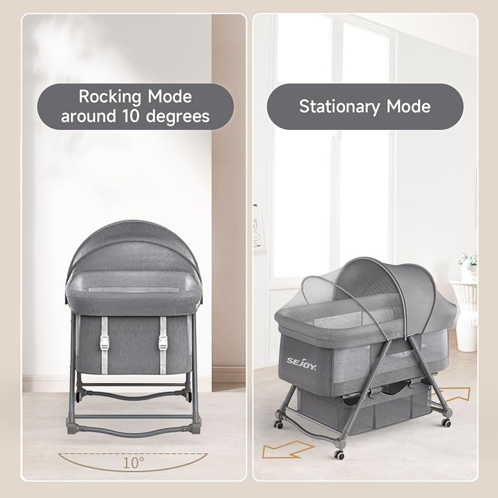 【علامة هيكلية علمية】①.يوفر سرير الأطفال بجانب السرير وضعين مزدوجين، مما يسمح لطفلك بالاسترخاء بأناقة. يمكنك التبديل بسهولة بين الوضع الهزاز والوضع الثابت عن طريق تحويل عجلات السرير. كما أنه مهد أطفال لحظات القيلولة الهادئة. 2. اضغط مع الاستمرار على الزر الموجود على جانب العجلة وقم بتدويره نحو الخارج، ويمكن تحويل مهد الأطفال متعدد الوظائف إلى وضع هزاز.