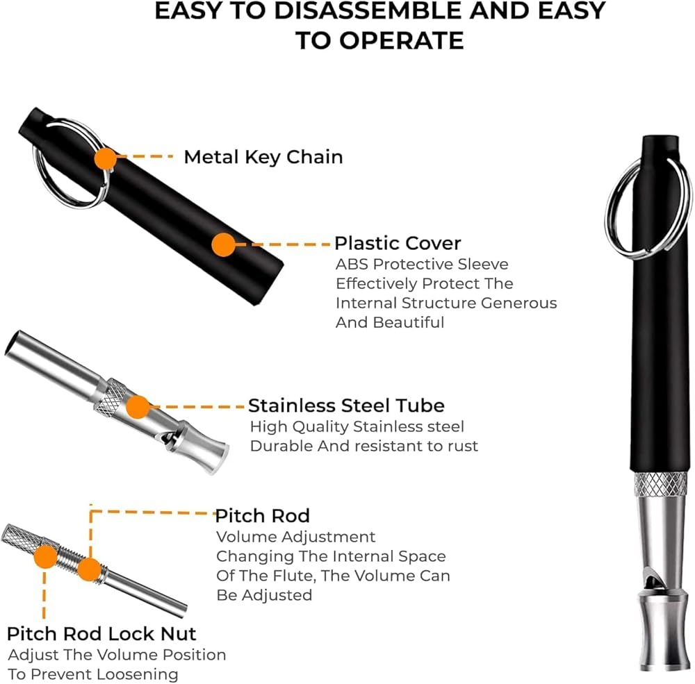 【dog training whistle ANTI-LOSS & SAFE DOG WHISTLE】New dual anti loss features with special lock nut & cover with free lanyard.Never worry about the loss or misplace of the dog whistle,bring it to anywhere you'd love to.Our dog whistle designed reasonable small size and made of premium stainless steel material,convenient to have it and long lifespan.Whistle sound is not so clearly for humane but is enough for dog.