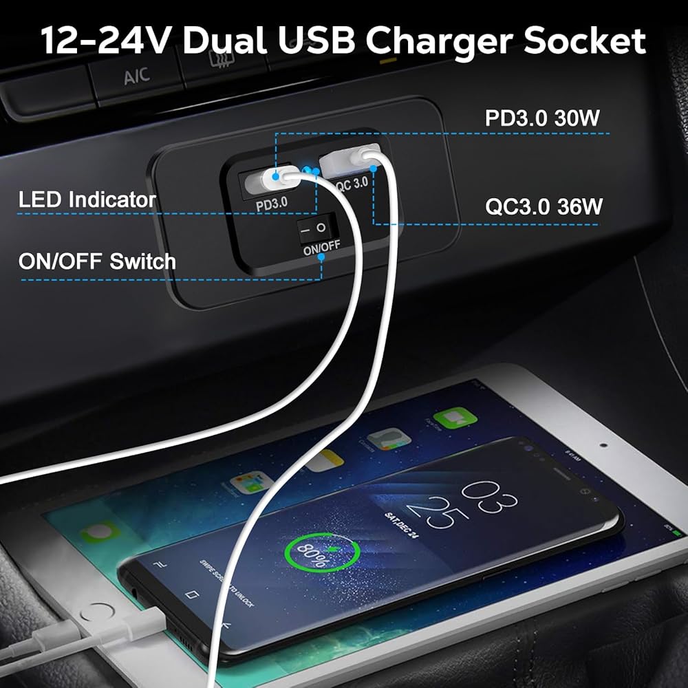 مقبس USB مزدوج للشحن السريع: منفذ USB مزدوج 12 فولت يشحن جهازين بسرعة عالية. يوفر منفذ PD طاقة 30 وات ومنفذ مراقبة الجودة يوفر 36 وات لمعظم الأجهزة المتوافقة حتى 50% في 30-35 دقيقة فقط.