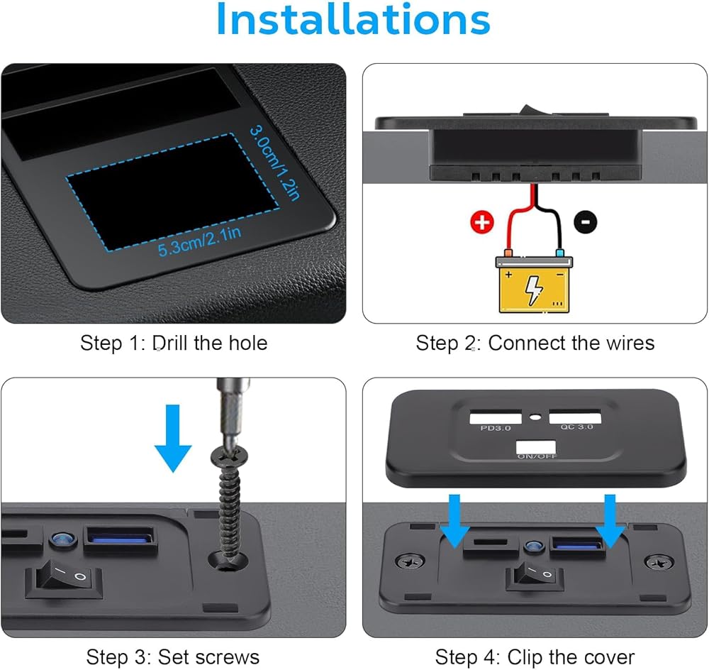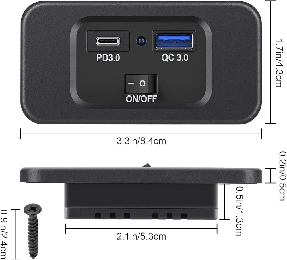 تطبيق واسع: منفذ USB rv هذا مناسب لأنظمة 12 فولت - 24 فولت ويمكن استخدامه على نطاق واسع لمعظم السيارات بتيار مستمر 12 فولت - 24 فولت، UTV/ATV، الشاحنات، المقطورات، RV، القافلة، الحافلات، البحرية، القوارب، اليخوت، الطائرات، إلخ. للتثبيت مع الأسلاك المسبقة.