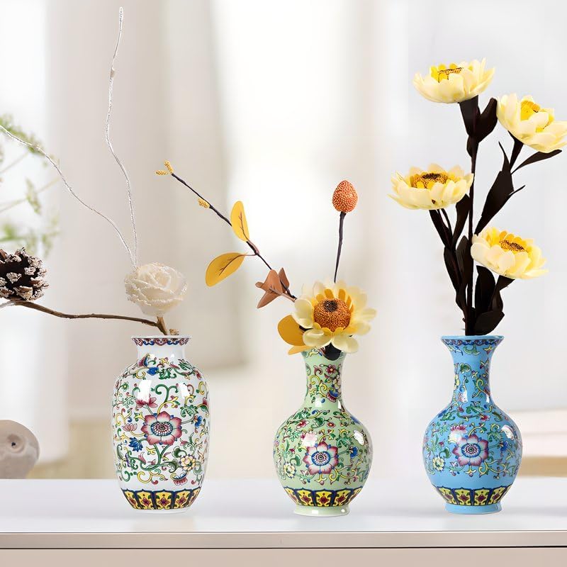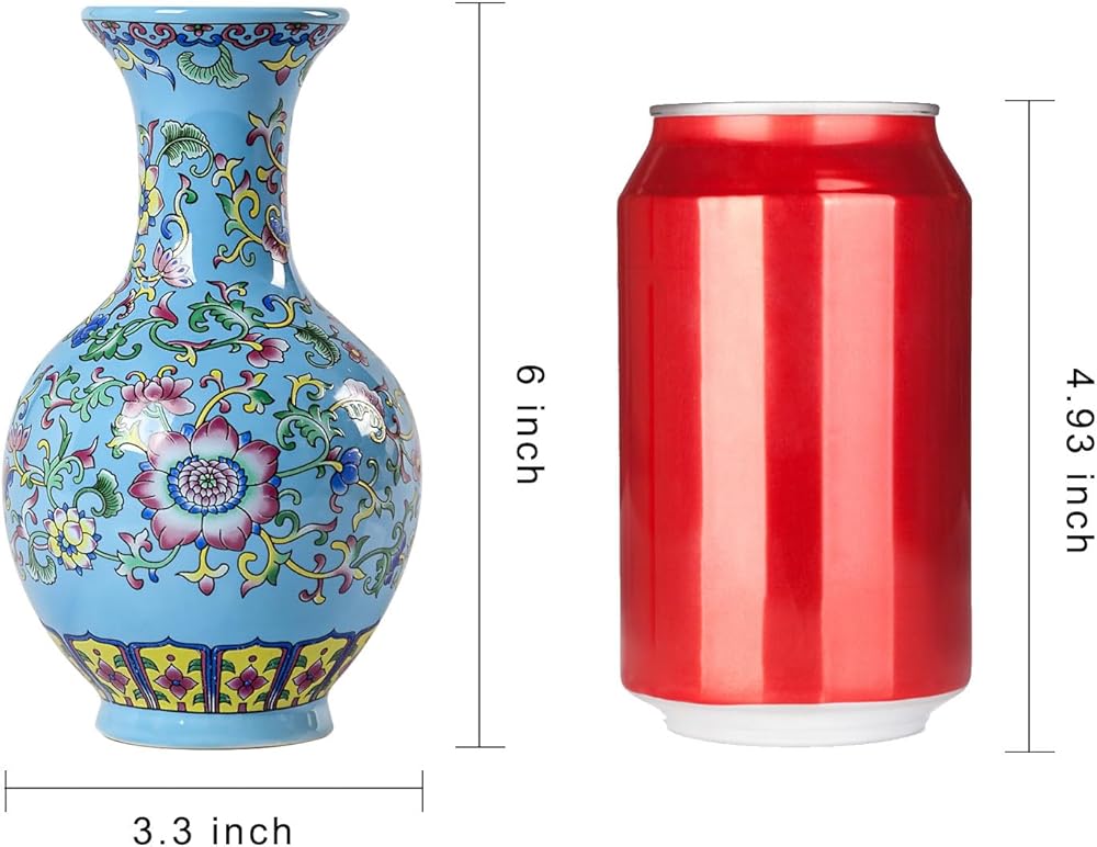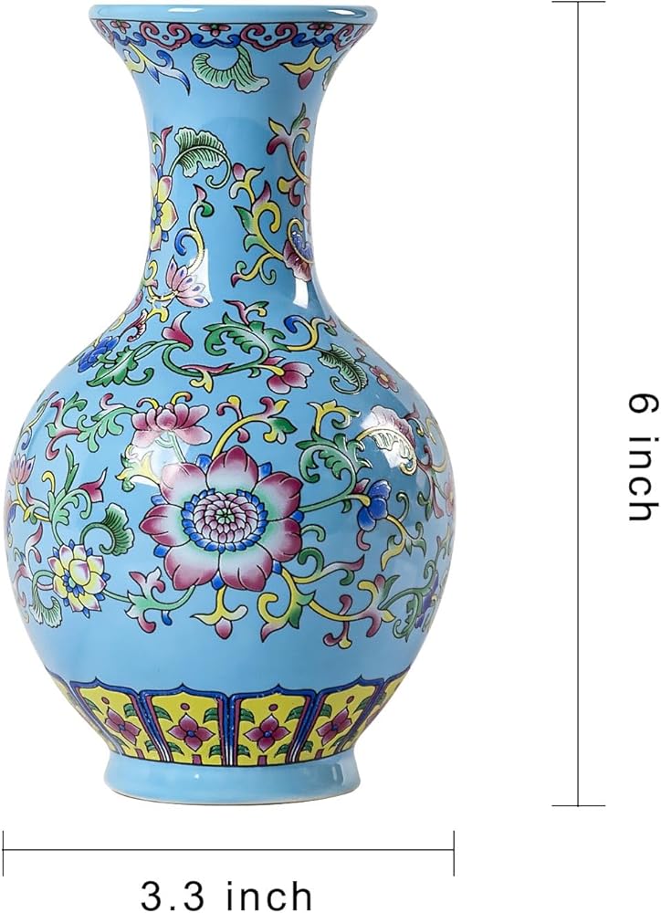 Traditional and Elegant Design: This small flower vase for home decor features a traditional lotus pattern. The intricate design and vibrant colors contribute to its elegant appearance. This vase could serve as a sophisticated centerpiece or a subtle accent in any room.