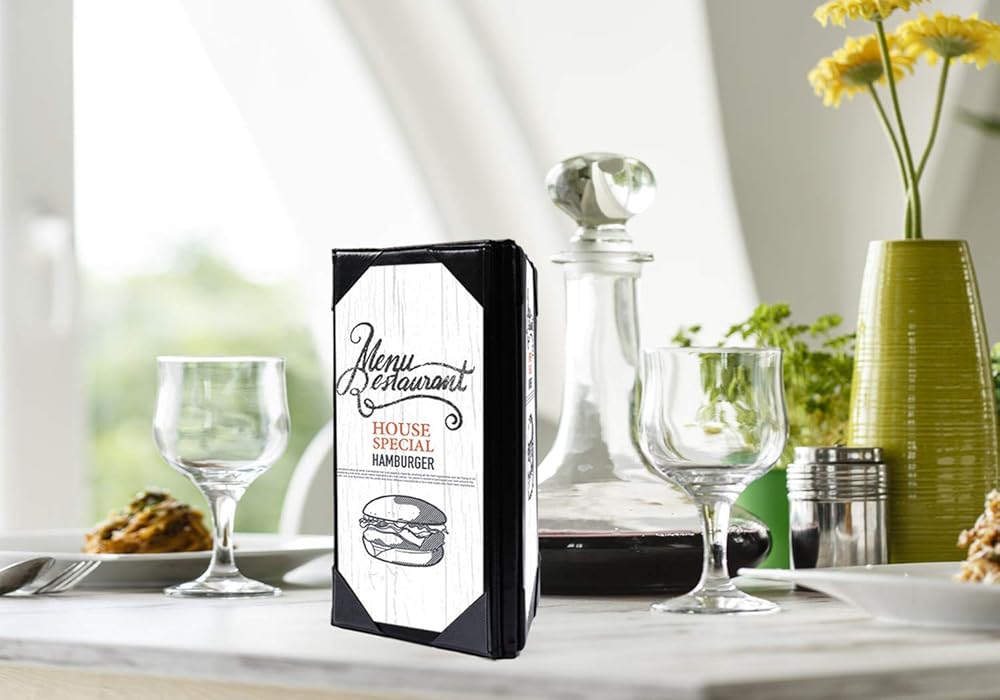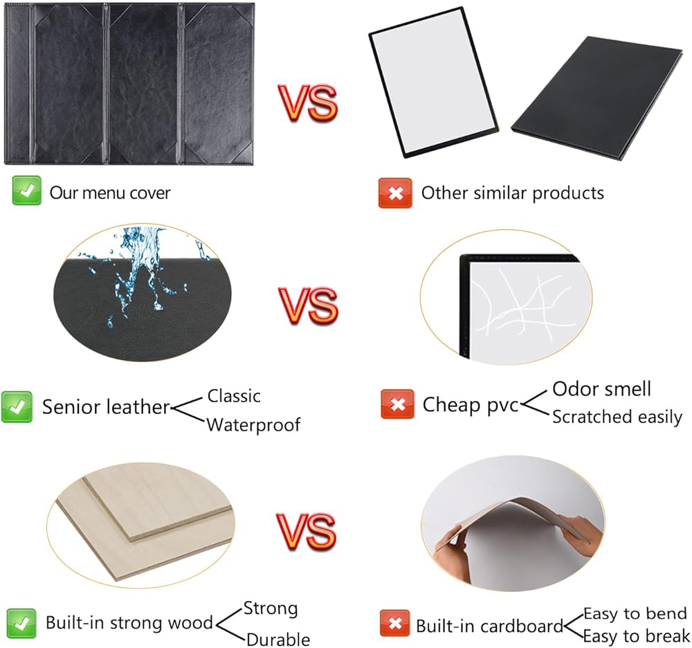 🍴 Durable Leather + Strong Wood : Our 4.25"x 11" menu covers is made of superior quality pu leather and strong wood wrapped inside, we only use the best materials to ensure our leather menu covers' wear resistance and durability. Our leather menu holder no any unpleasant smell and soft handle, strong and durable. Our leather menu holder is non-shattering, non-toxic and pollution-free.