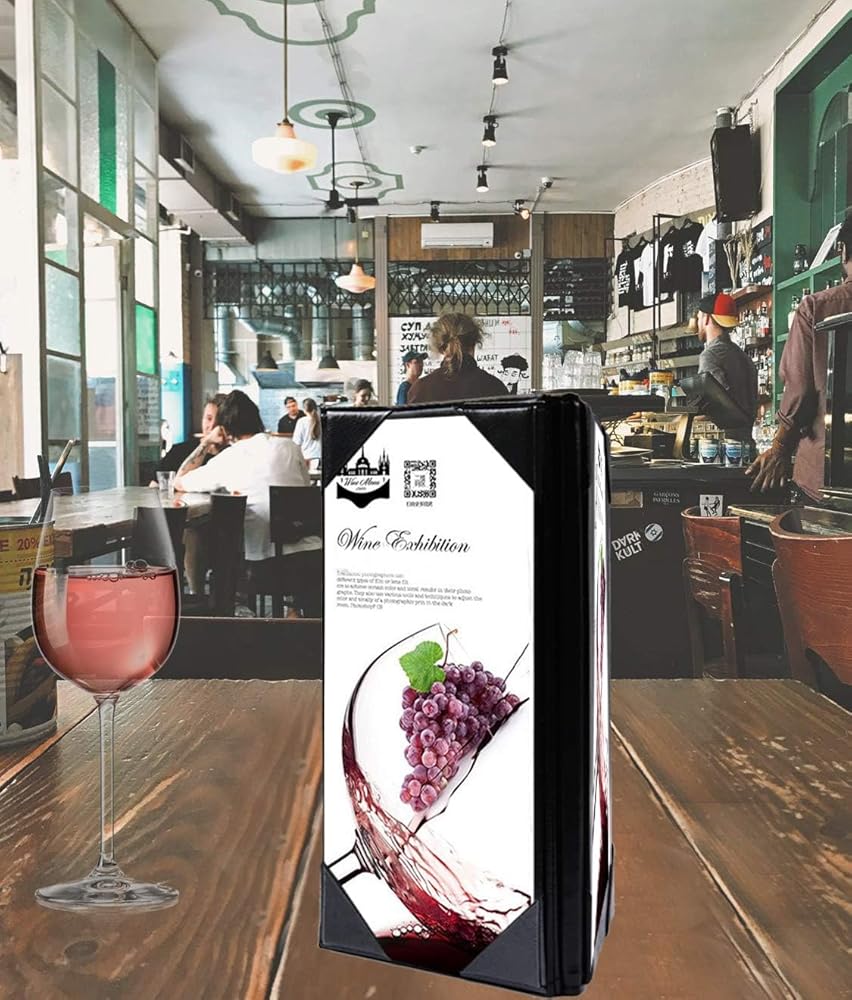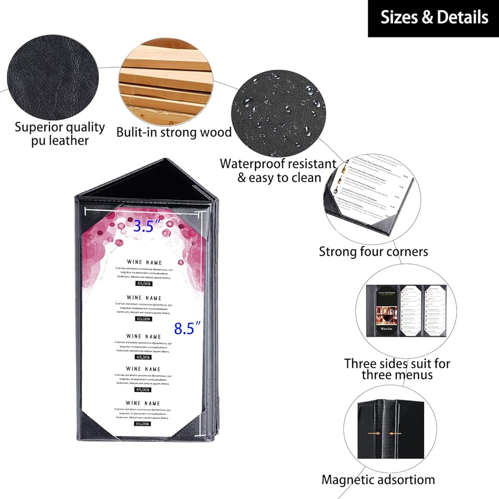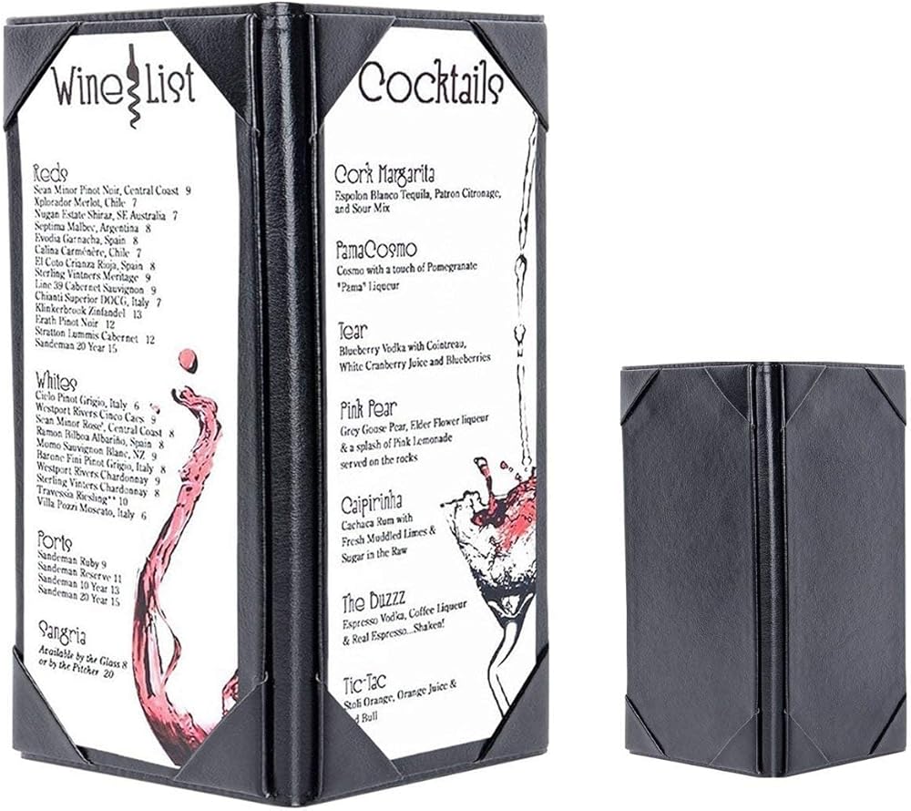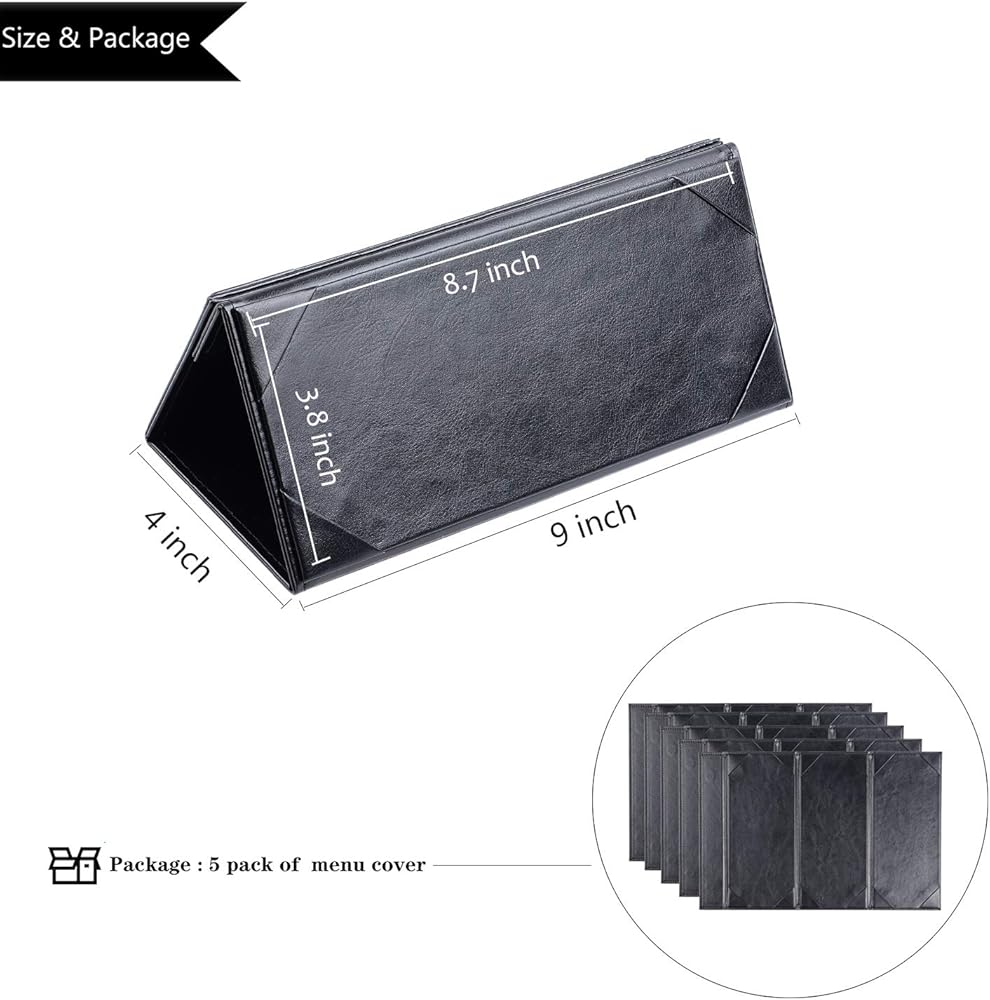 About our leather menu holder: Our leather menu covers size : 5 X 11.6 inches, fits six view inserted menu size should be 4.25 x 11 inches. Our leather menu covers are adopt to plain all black design with no logo printed inside, universal size for various occasion, perfectly work as restaurants, bars, hotels, cafes, and more! Our restaurant menu covers is made of superior quality pu leather, it's no any unpleasant smell and soft handle, strong and durable, has waterproof surface, oil-proof, when you accidentally spill something on the leather menu covers, our leather menu holder can be easily wiped clean with napkin or towels. Product Description: Material : superior quality pu leather Color : black leather menu holder Cover Size : 5" X 11.6" Inserted Menu Size : 4.25" x 11" Weight : 0.95 Ib / 0.43 Kg Package Include: 1 pcs x leather menu cover