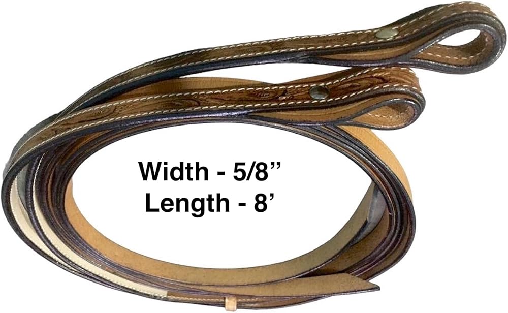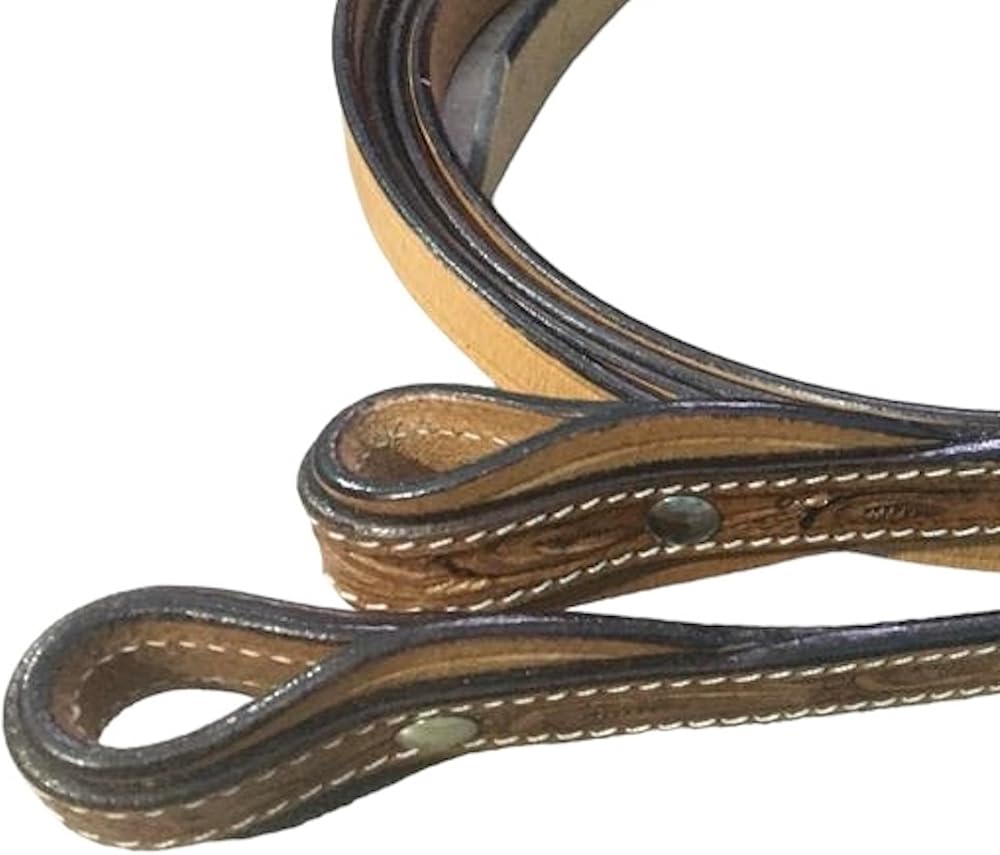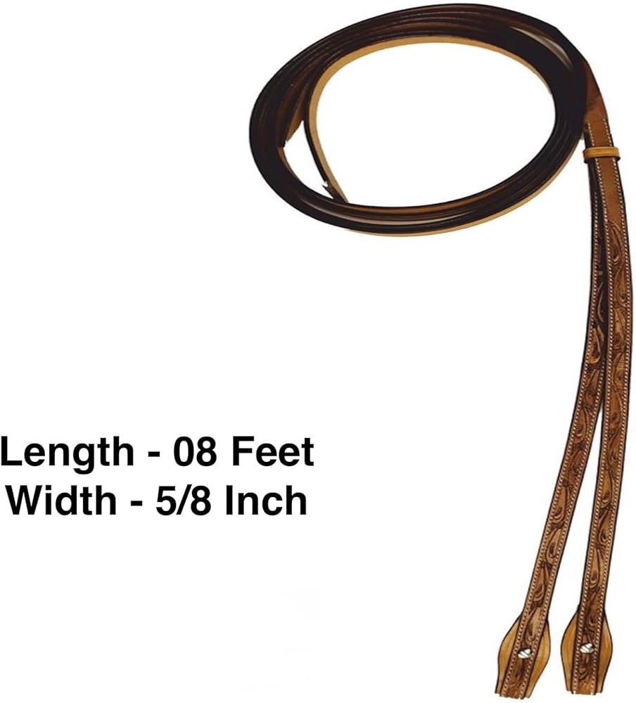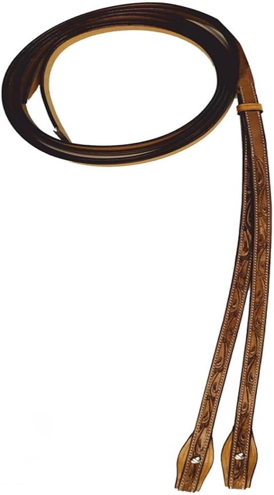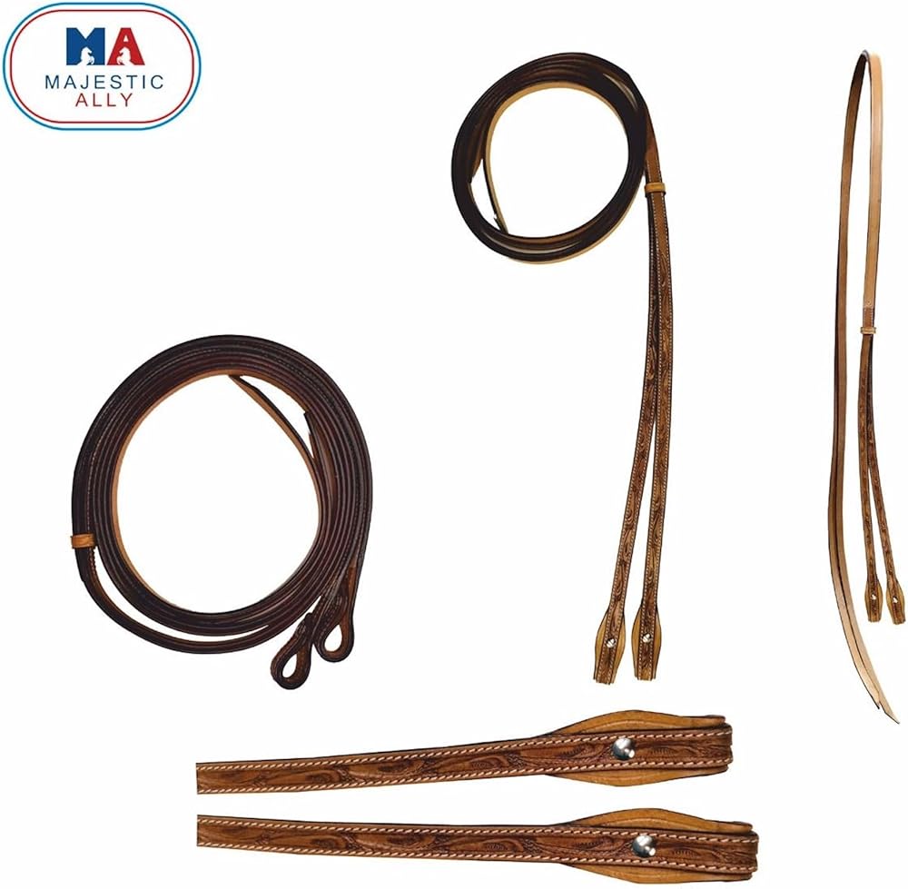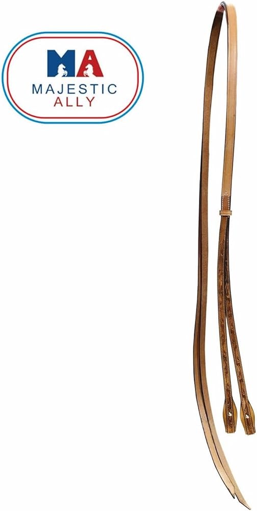 Introducing the Majestic Ally Horse Reins, a fine testament to both craftsmanship and style. These reins are meticulously crafted from natural harness leather with a beautiful hand-tooled antique finish, offering not only durability but also an exquisite aesthetic. Measuring at a comfortable 5/8" in width and extending to a generous 8 feet in length, these reins provide optimal handling and flexibility during your equestrian endeavors. The hand-tooling process ensures a unique and refined appearance, making them a standout accessory for your horse. The antique finish not only adds a touch of sophistication but also enhances the overall durability of the reins, making them a reliable choice for your riding needs. The supple natural harness leather ensures a comfortable feel in your hands, facilitating clear communication with your horse. Whether you're engaged in training, trail riding, or any equestrian activity, the Majestic Ally Horse Reins offer a blend of functionality and style. Elevate your riding experience with these hand-tooled reins that perfectly complement your horse's gear. Key Features: - Crafted from natural harness leather with a hand-tooled antique finish. - 5/8" width and generous 8' length for optimal handling and flexibility. - Unique and refined appearance due to the hand-tooling process. - Antique finish adds sophistication and enhances durability. - Supple natural harness leather ensures a comfortable grip. - Ideal for various equestrian activities, including training and trail riding.