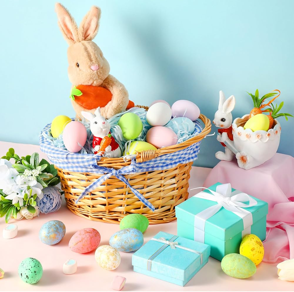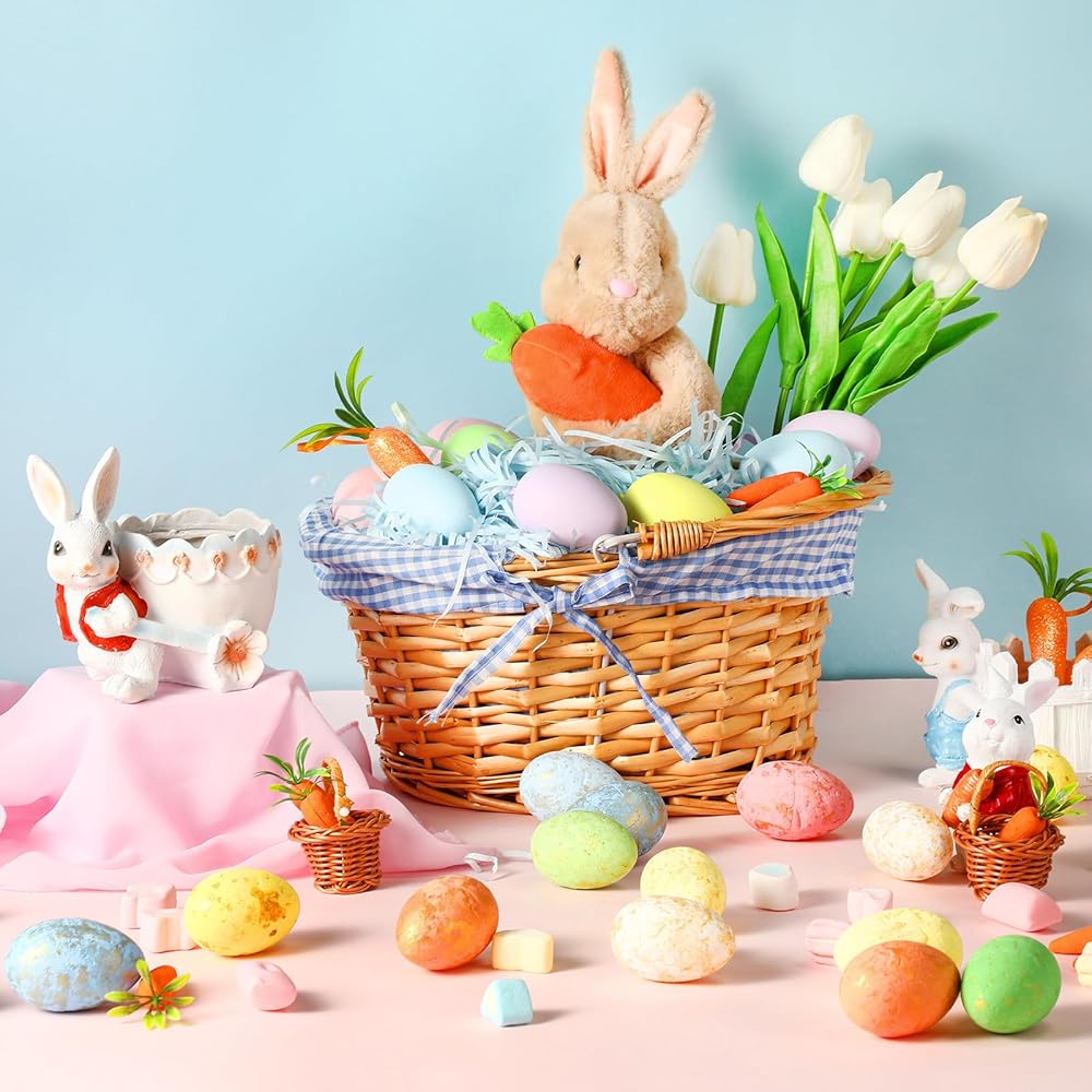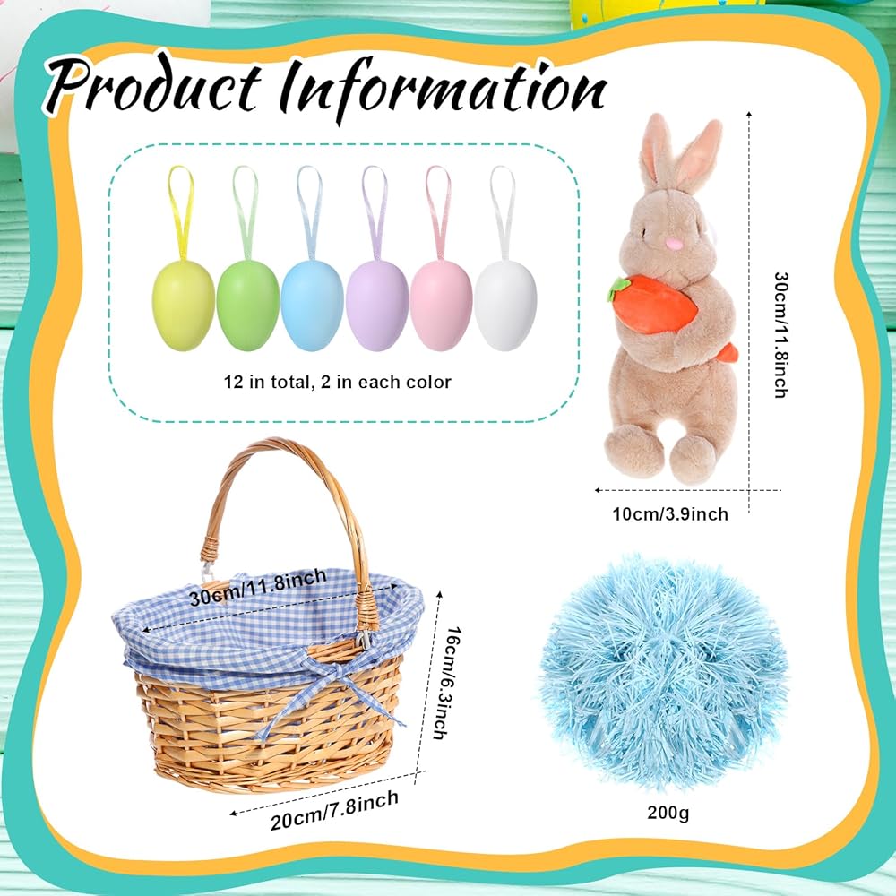 • Sufficient Package Set for Easter Celebration: this Easter basket set can meet your Easter celebration needs; It includes an Easter wicker basket, a charming gingham liner for the basket, a soft plush bunny, and 12 colorful plastic Easter eggs for a delightful egg hunt, and a pack of raffia grass for added authenticity; These quality items bundled together save you time, offering seamless convenience for a memorable Easter holiday