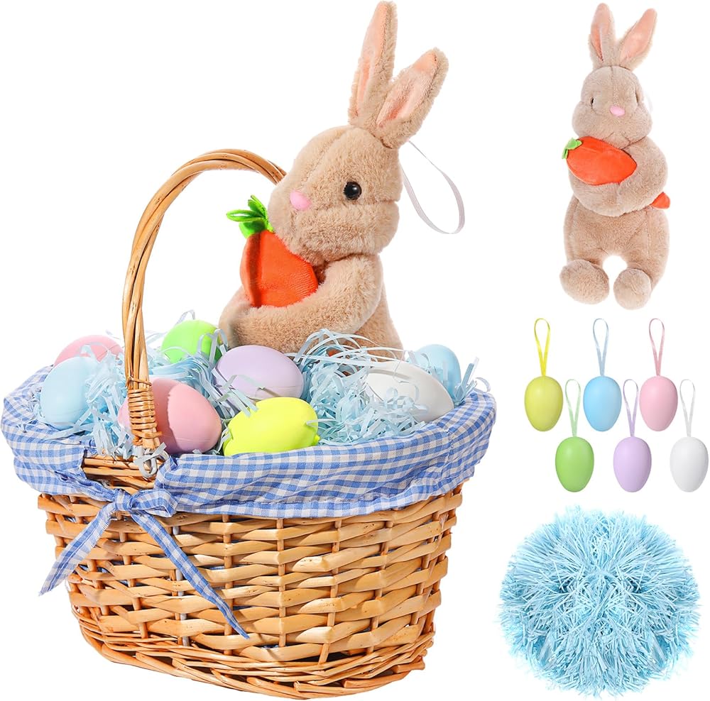 سلة هدايا أرنب عيد الفصح من سيليفين، تتضمن سلة خوص مع بطانة قطنية، أرنب عيد الفصح القطيفة، بيض عيد الفصح، عشب ورق الرافية، هدايا عيد الفصح لتزيين حفلات النزهة (أزرق)