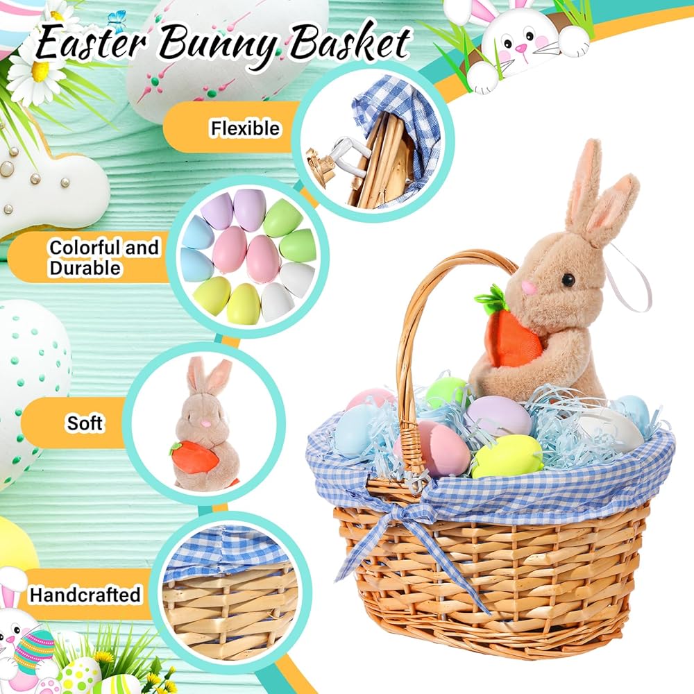 • Quality Material for Long Lasting Durability: the Easter basket is handcrafted from hard wearing willow wood, ensuring longevity and robustness; Additionally, the accompanying Easter bunny, made from plush material, offers delightful softness for heartwarming cuddles; And not to forget, the multicolored Easter eggs made from sturdy plastic, which is reusable for egg hunts