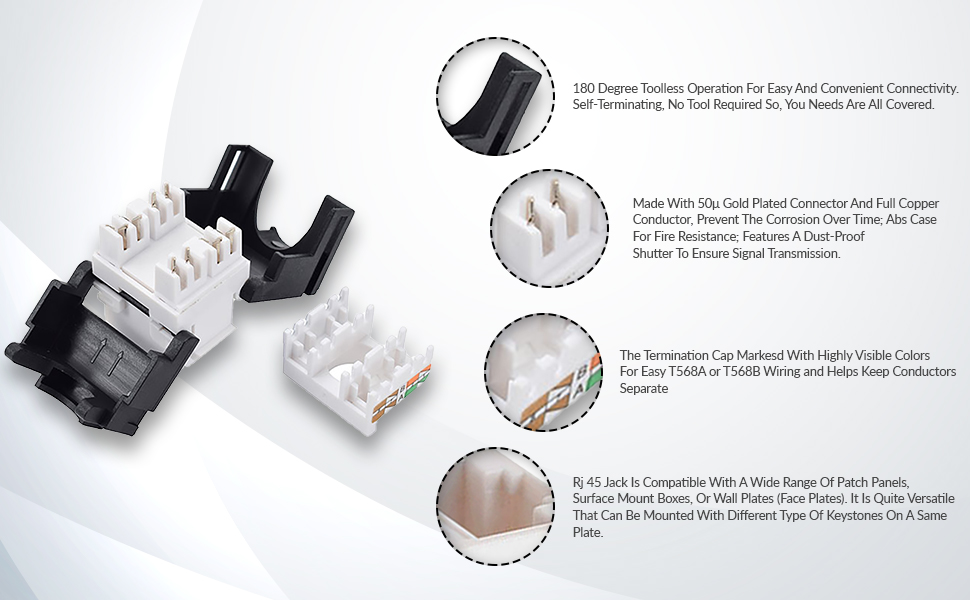 تم تصميم مقبس الحائط RJ45 ETHERNET للاتصال السهل للغاية لمساعدتك على الاستمتاع بسرعات النطاق الترددي التي ترغب فيها. مع دعم من 22 إلى 26 سلكًا بمعيار AWG، يتمتع الجهاز بأعلى أداء. متوافق أيضًا مع كل من كابلات شبكة الموصلات الصلبة والمجدولة. تدعم مقابس Cat6 Keystone لوحة التصحيح ولوحة حائط إيثرنت.