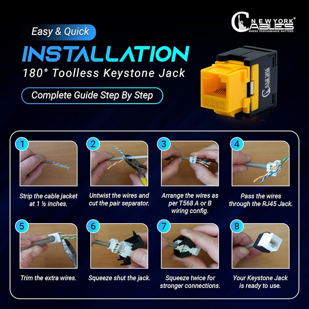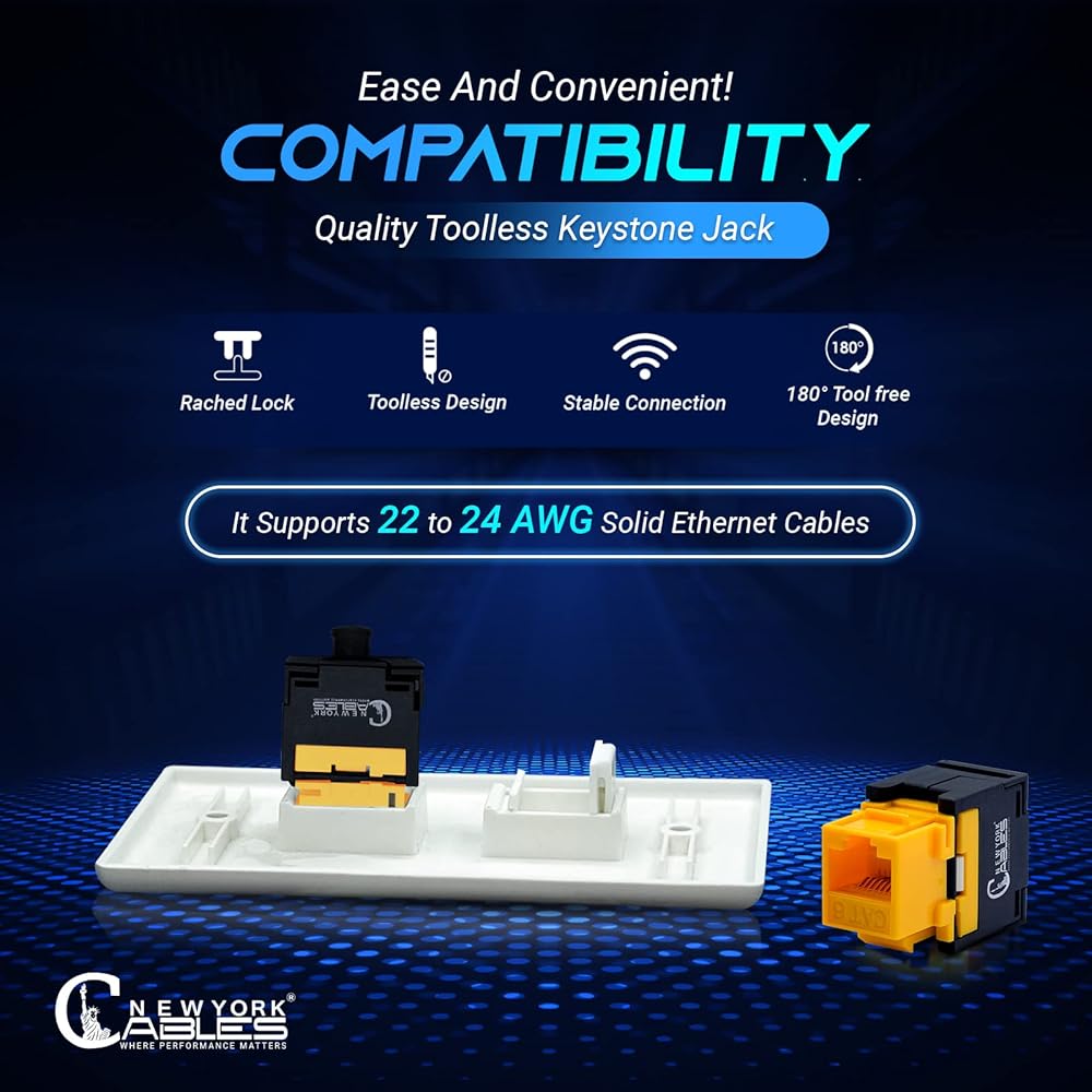 يتوافق مقبس PREMIUM CAT KEYSTONE مع جميع لوحات الحائط ولوحات التصحيح في العصر الحديث، وكابل إيثرنت، وكابل إيثرنت cat 6e، ولوحة تصحيح كيستون سواء كان نظام الشبكة الخاص بك يتكون من كابلات Cat6 أو Cat6a. سيوفر أقصى سرعة لعرض النطاق الترددي بسهولة.
