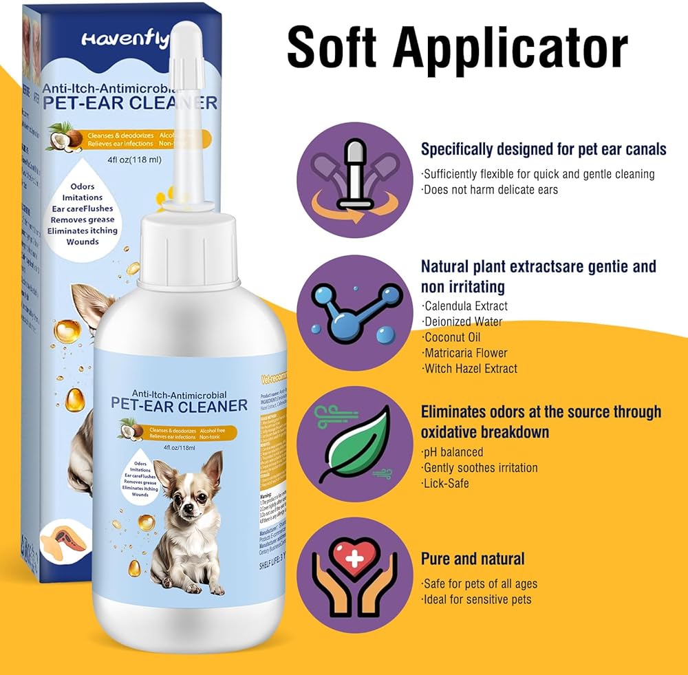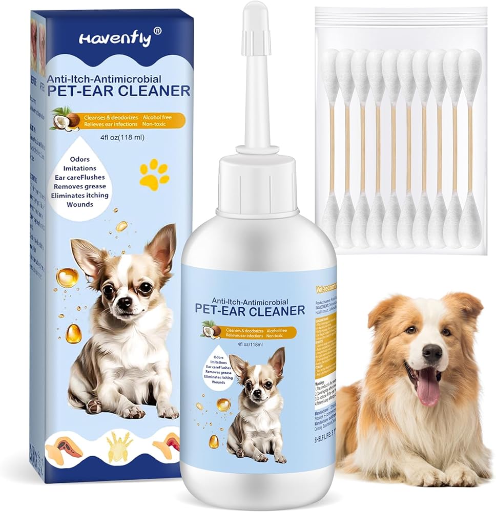 هافينفلاي منظف الأذن للكلاب والقطط، 4 أوقية. - قطرات لطيفة للعناية بالأذن، وتخفيف الحكة، وتلطيف الالتهاب، وإزالة الشمع، والرائحة. تتضمن 10 مسحات قطنية